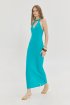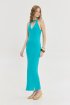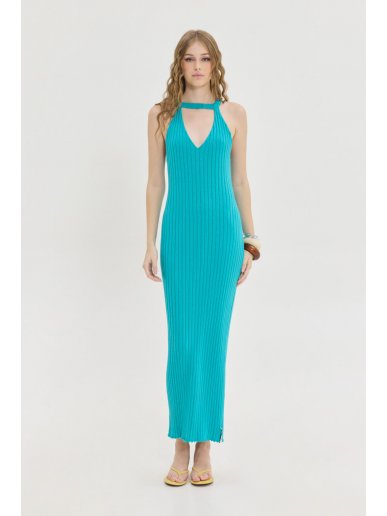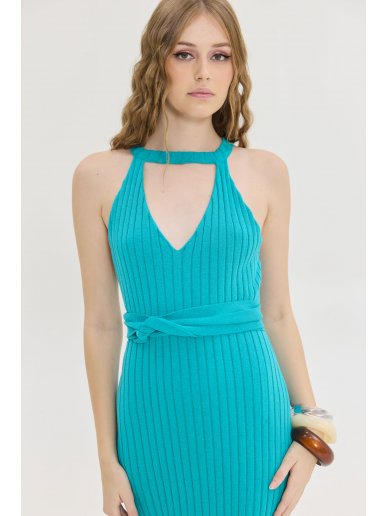 Φόρεμα με v-neck λαιμόκοψη σε έντονο πετρόλ χρώμα από την Hemithea. Λαιμόκοψη ψηλά στο λαιμό. Ύφανση ριπ. Αμάνικο με παρτούς ώμους. Κλειστή πλάτη. Mixi μήκος. Έξτρα πλεκτό ζωνάκι. Υφαντό ταμπάκι. Σύνθεση:  50% Cotton, 50% Dralon