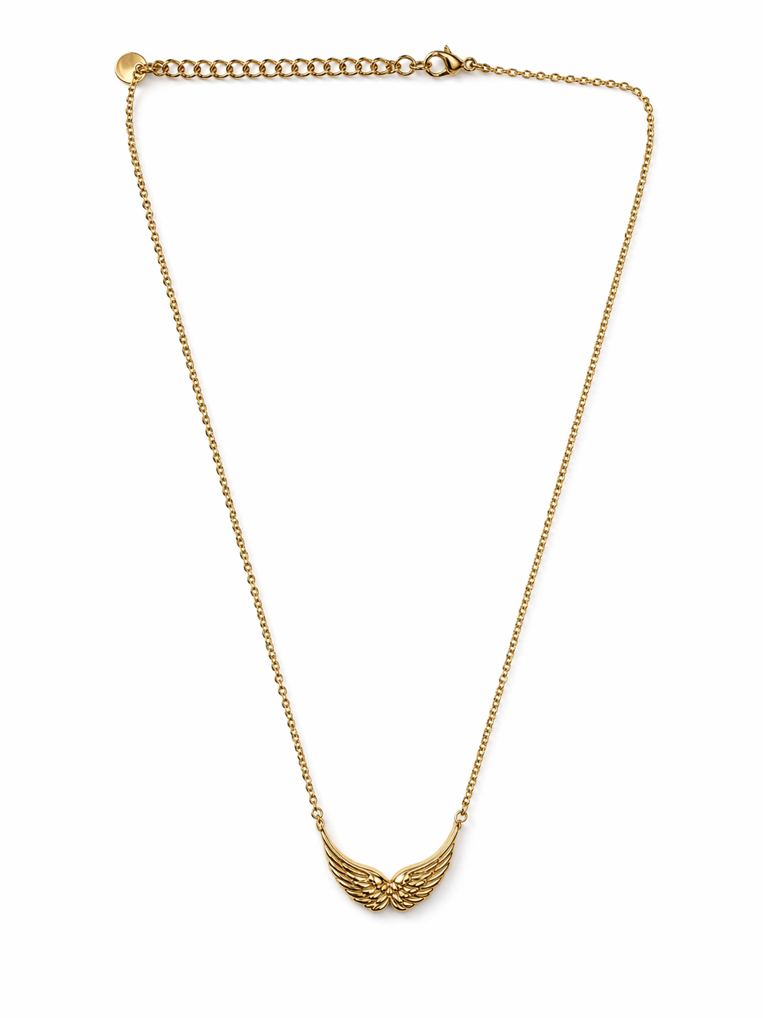 Ατσάλινο κολιέ, σε χρυσό με συμμετρικά φτερά. Mήκος 40εκ. + 5εκ. έξτρα αλυσιδάκι επέκτασης.