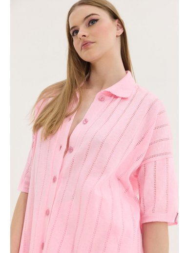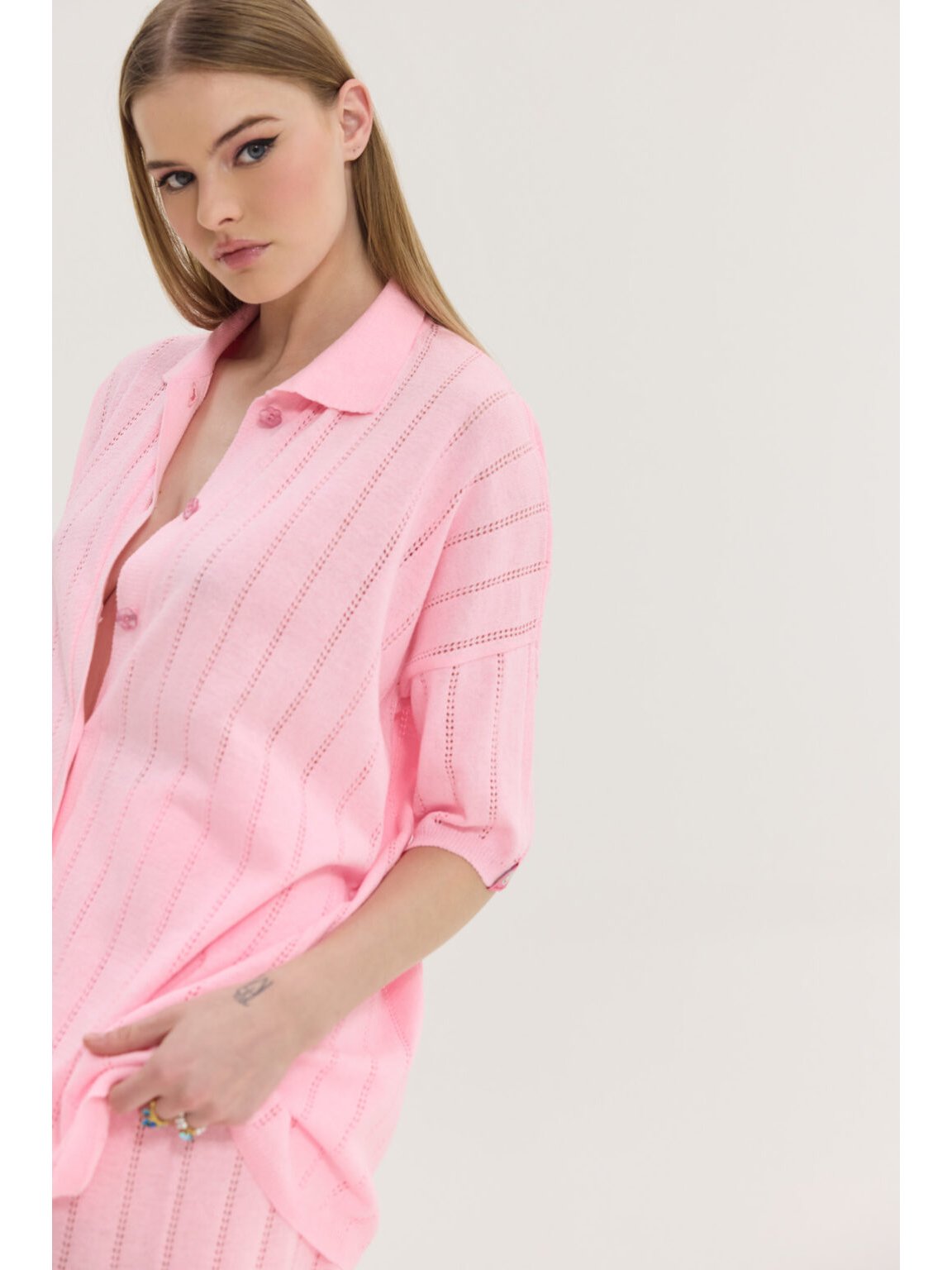 Ροζ πλεκτό πουκάμισο από την Hemithea. Κοντά μανίκια. Ελαφρώς διάτρητο με κάθετη διάταξη. Κλείσιμο με  κουμπιά περλέ μαργαρίτες στο ίδιο χρώμα. Γιακάς. Oversized γραμμή. Υφαντό ταμπάκι στο μανίκι. Σύνθεση :  50%Cotton 50% Dralon.