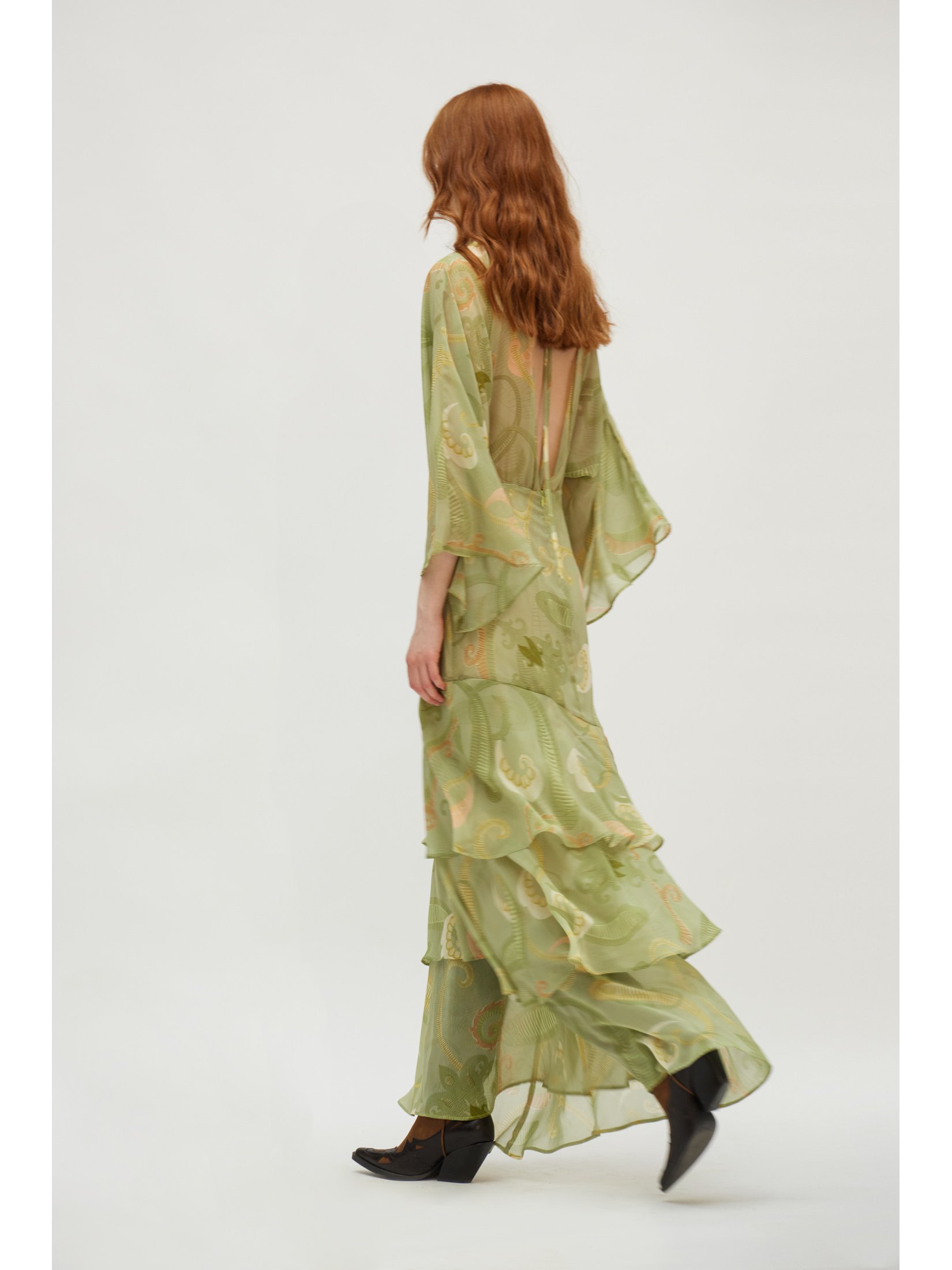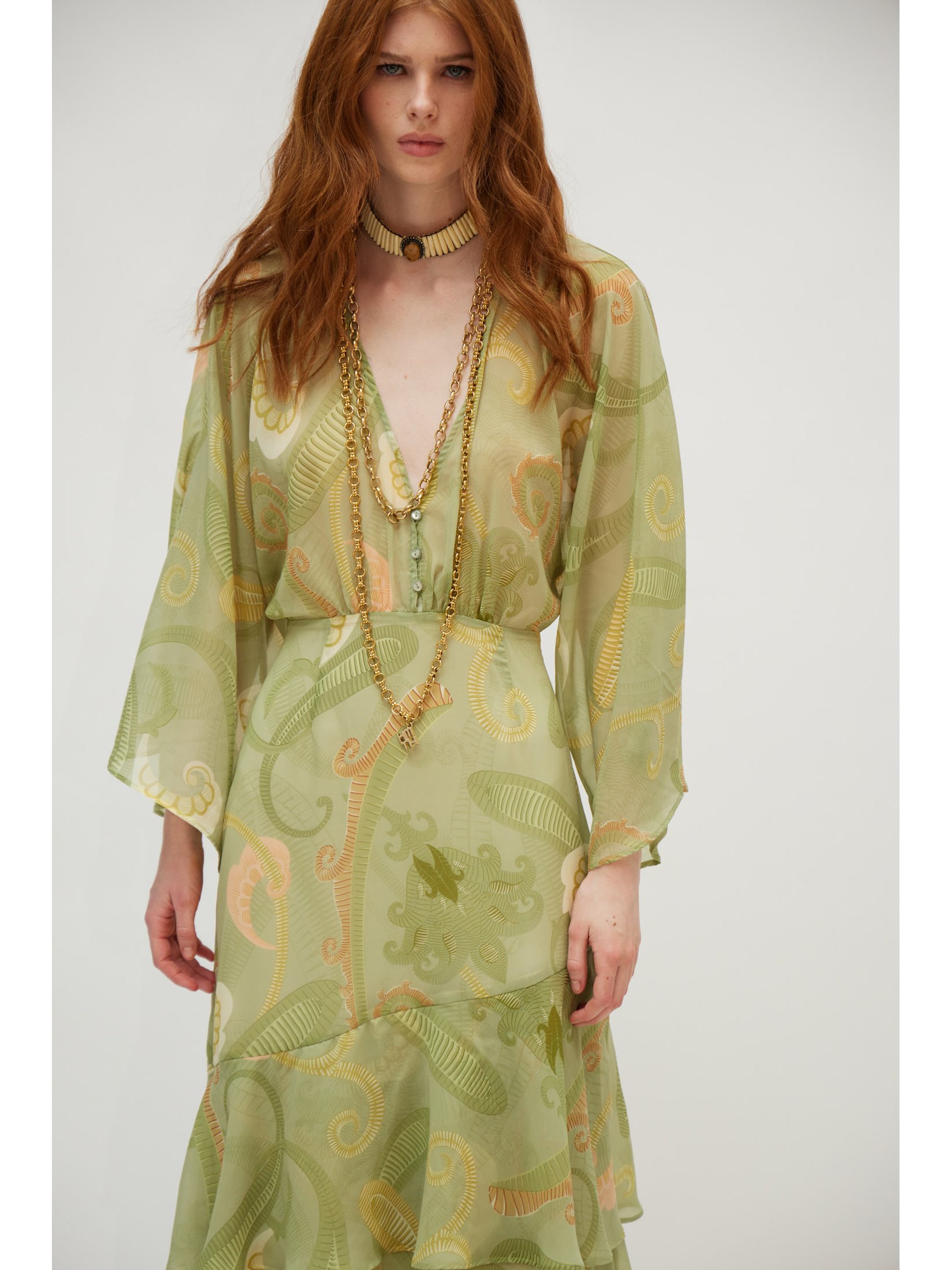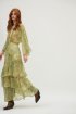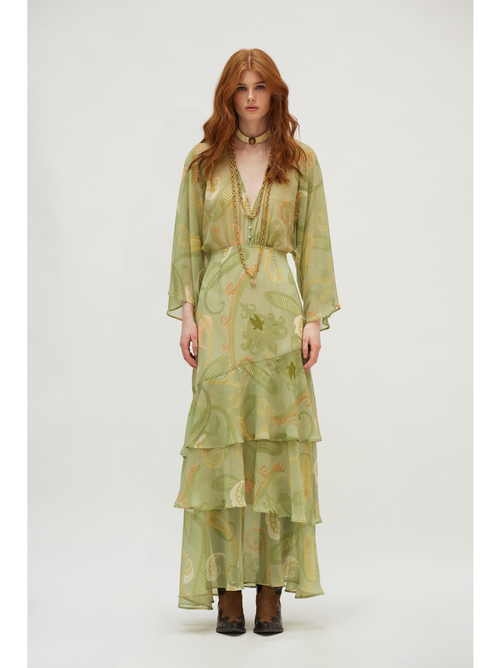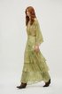 Maxi φόρεμα με pattern με λαχούρια σε πράσινο φόντο. Inspiration: Queensland. Βαθύ V-neck. Φαρδιά μανίκια flare. Έντονα βολάν κατά μήκος όλου του φορέματος. Αέρινο ύφασμα. Regular fit. Κλείσιμο με μικρά κουμπάκια στο στήθος. Σύνθεση: 100% recycled polyester