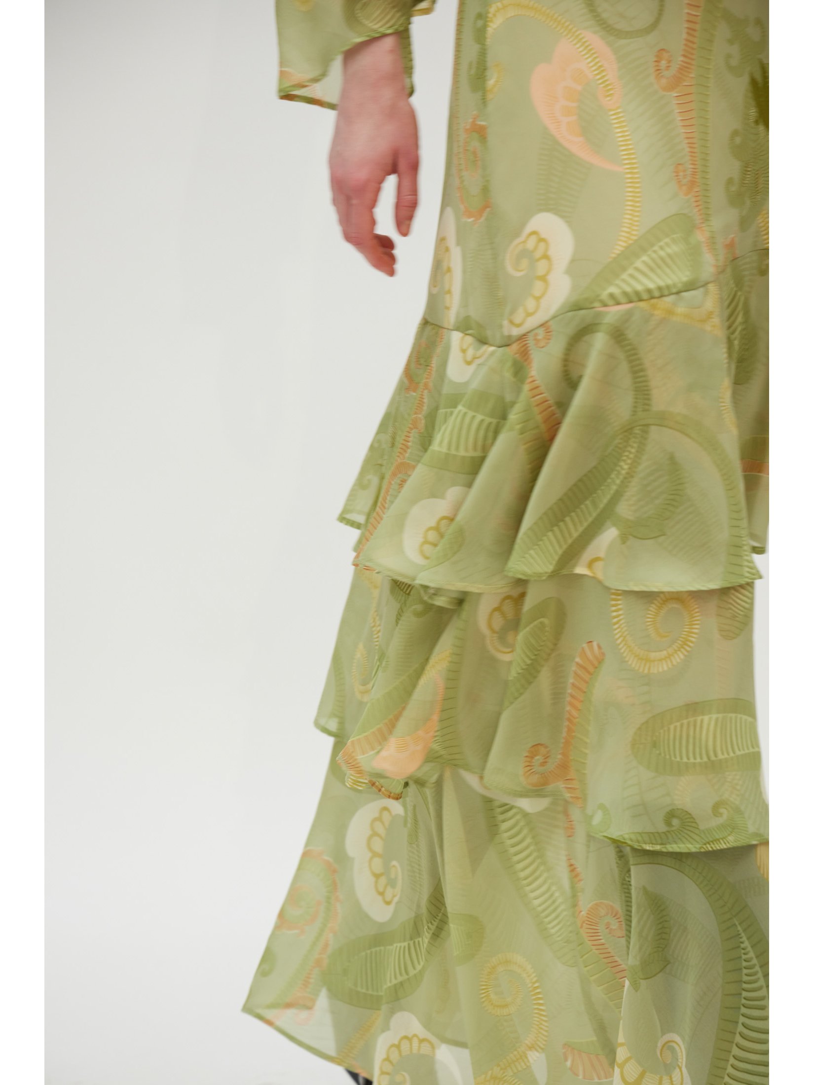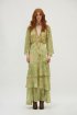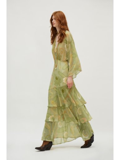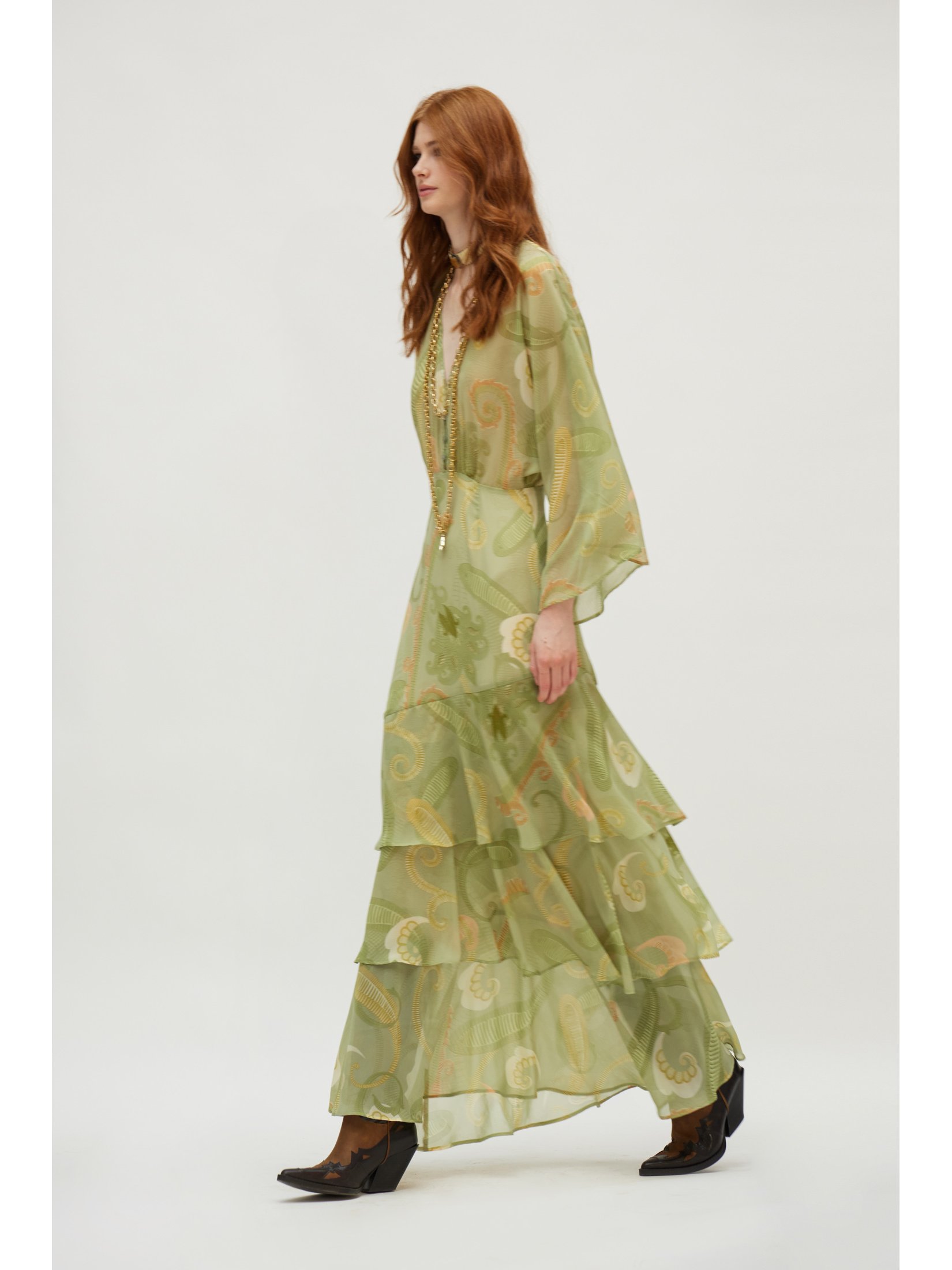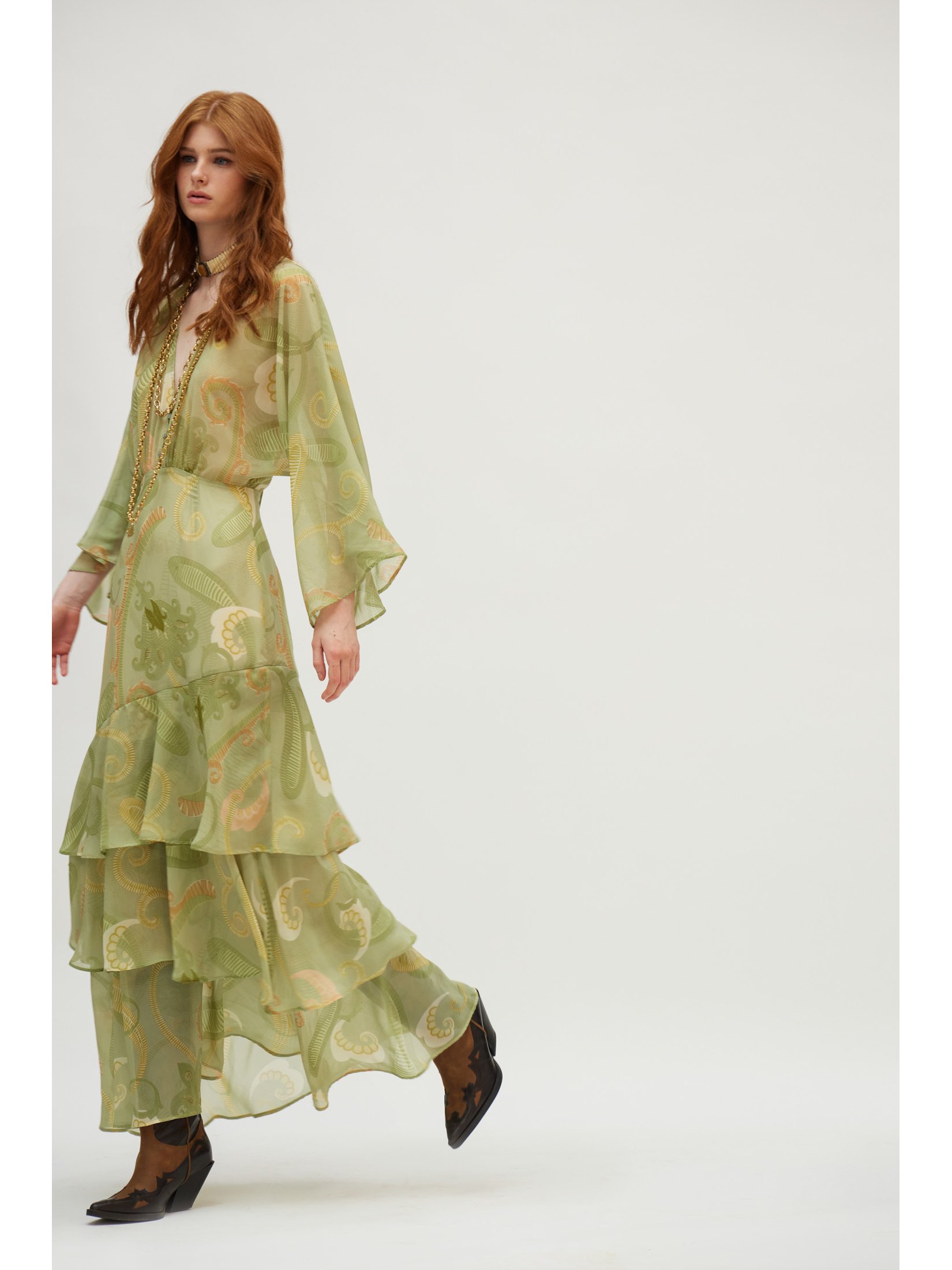 Maxi φόρεμα με pattern με λαχούρια σε πράσινο φόντο. Inspiration: Queensland. Βαθύ V-neck. Φαρδιά μανίκια flare. Έντονα βολάν κατά μήκος όλου του φορέματος. Αέρινο ύφασμα. Regular fit. Κλείσιμο με μικρά κουμπάκια στο στήθος. Σύνθεση: 100% recycled polyester