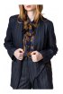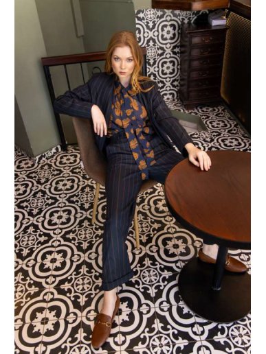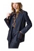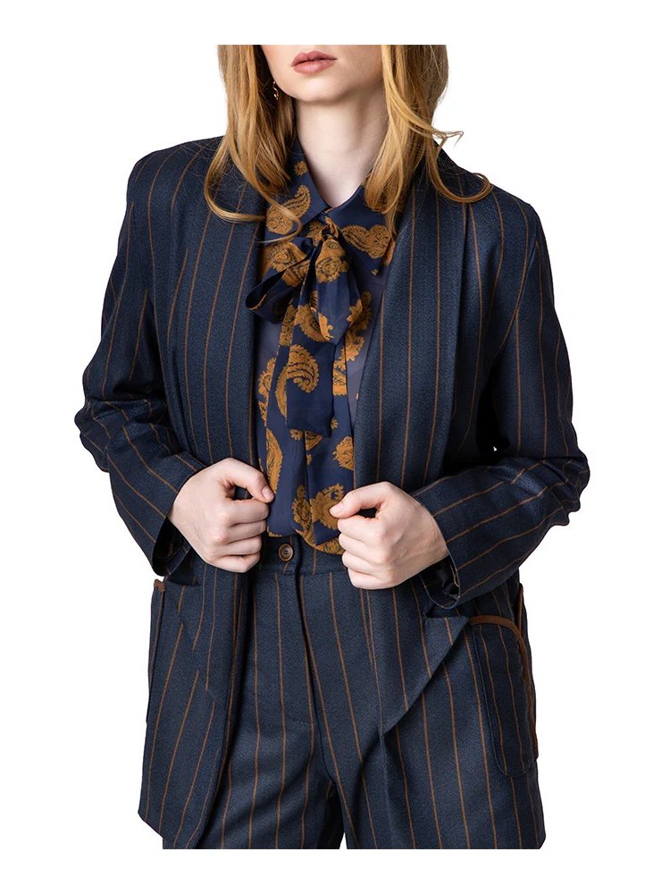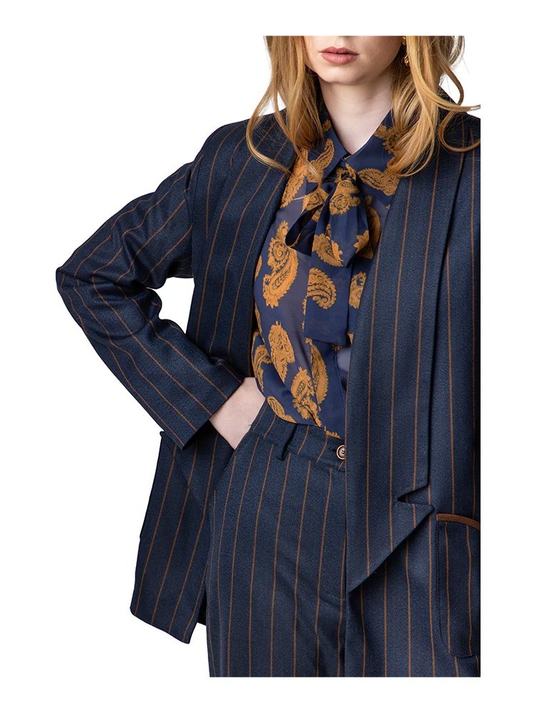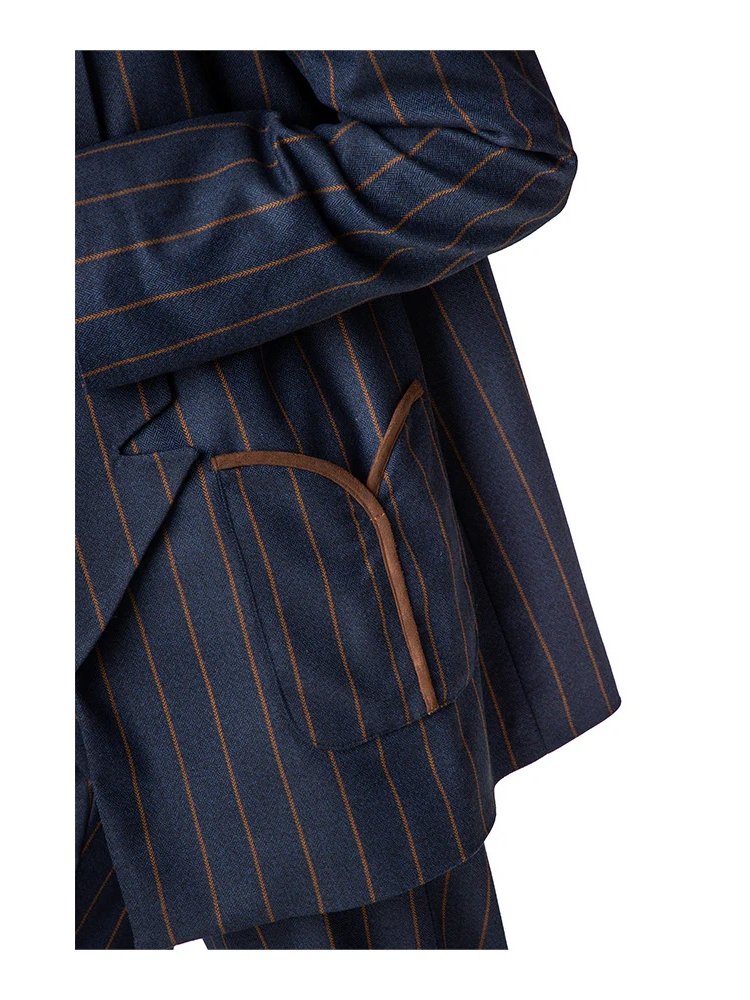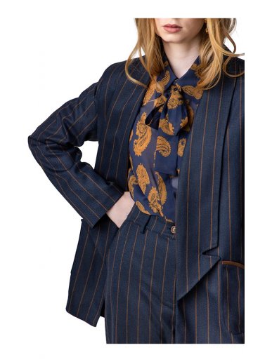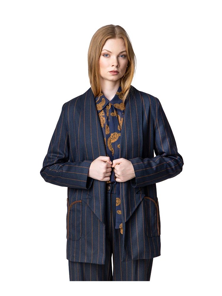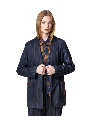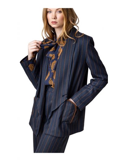 Μπλε σακάκι με καφέ ριγές σχέδιο από την Debutante. Ανάποδο πέτο, βάτες και εσωτερική φόδρα Πλαινές εξωτερικές τσέπες.  Εσωτερική πλεκτή κόπιτσα στη βάση του πέτου για κλείσιμο.  Σύνθεση: 62% PL, 35% Βισκόζη, 3% Ελαστίνη.