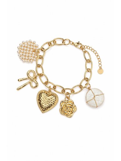 Ατσάλινο βραχιόλι αλυσίδα με κρεμασμένα  καρδιά, περλέ στοιχείο, λουλούδι, φιόγκος και στρογγυλό charm. Κατασκευασμένο από ανοξείδωτο ατσάλι, υποαλλεργικό και ανθεκτικό χωρίς περιορισμούς στη διάβρωση.