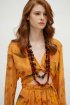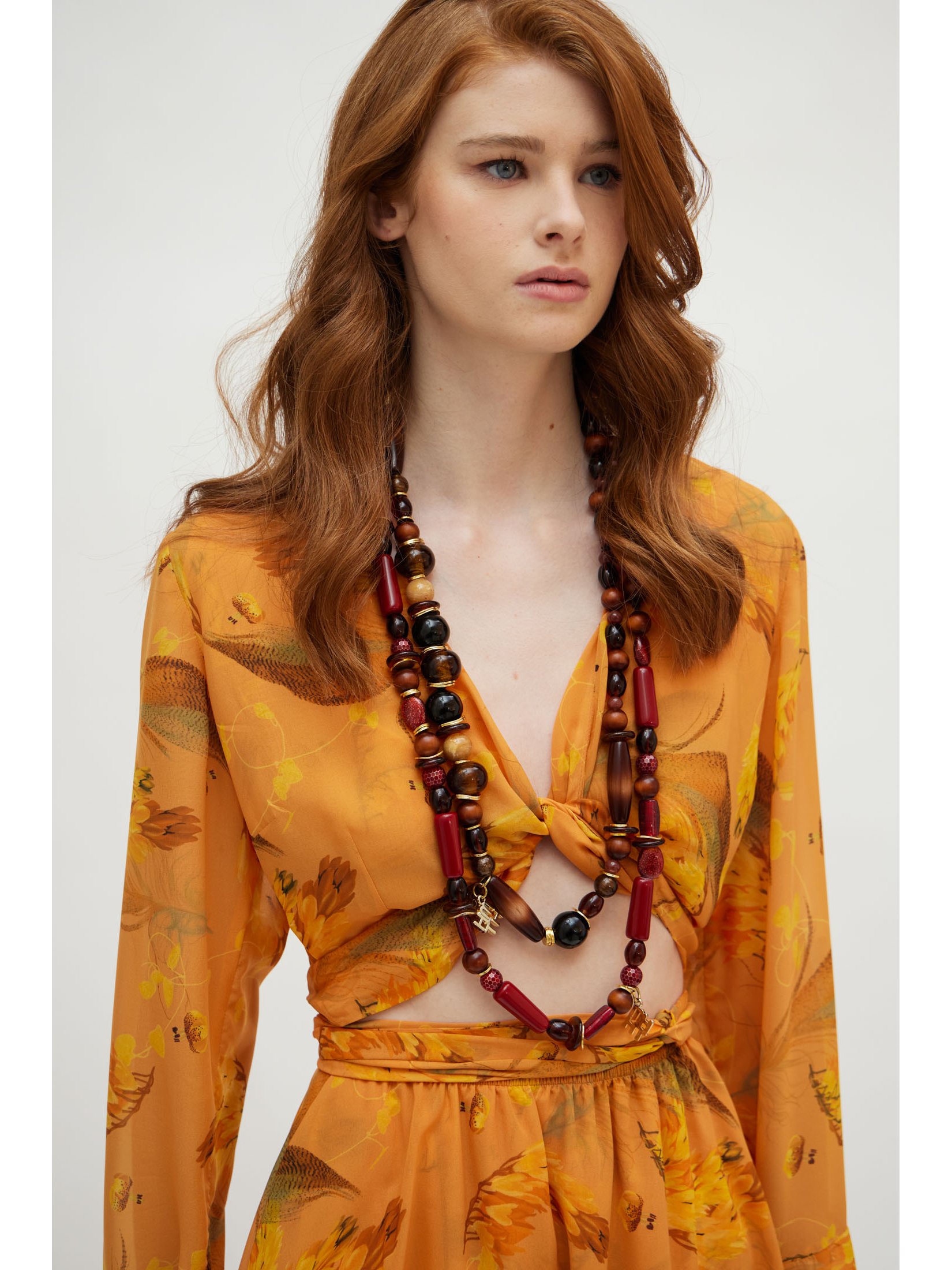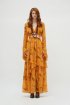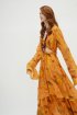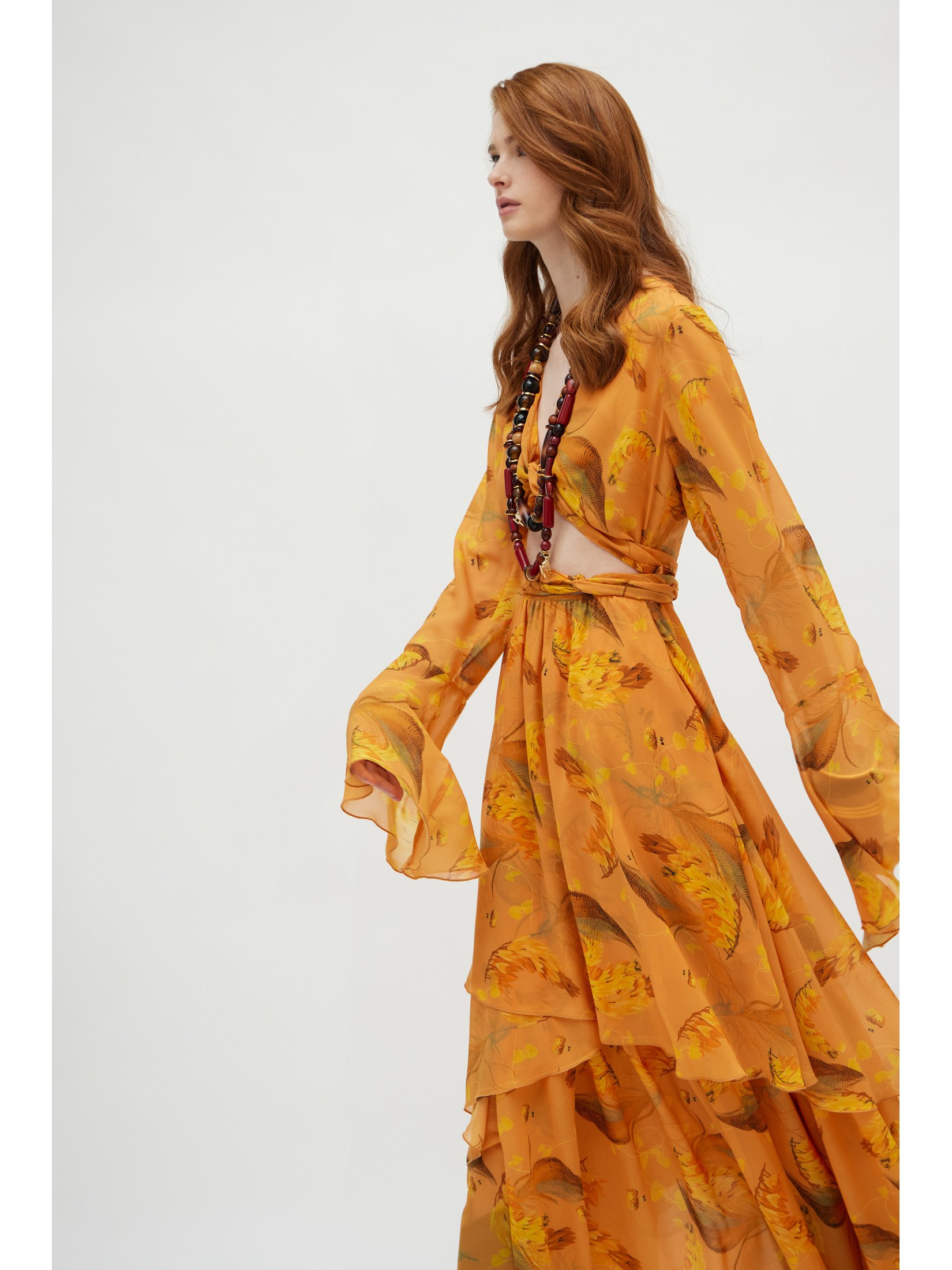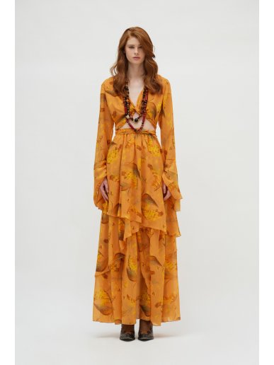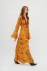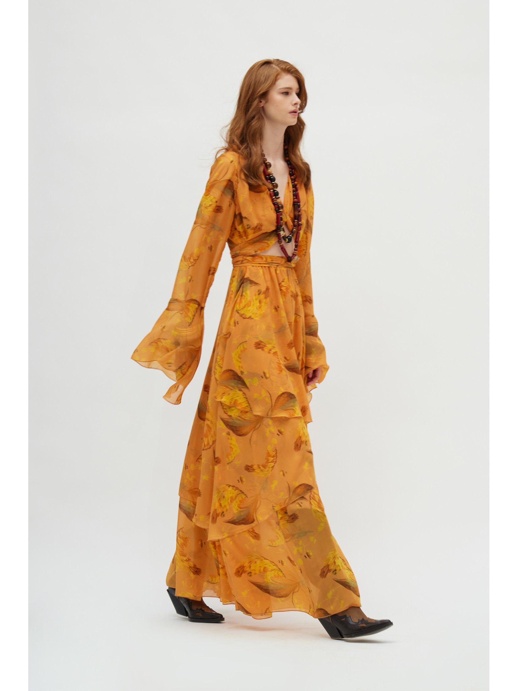 Maxi αέρινο φόρεμα με pattern με πουπούλα και λουλούδια από την Hemithea. Βολάν στην φούστα. Κρουαζέ μπούστο με διάφορα δεσίματα. Μακριά μανίκια που τελειώνουν σε μεγάλο βολάν. Αέρινη φούστα που δεν κολλάει. Λάστιχο στην μέση. Φόδρα μέσα από την φούστα. Σύνθεση: 100% Recycled PL.