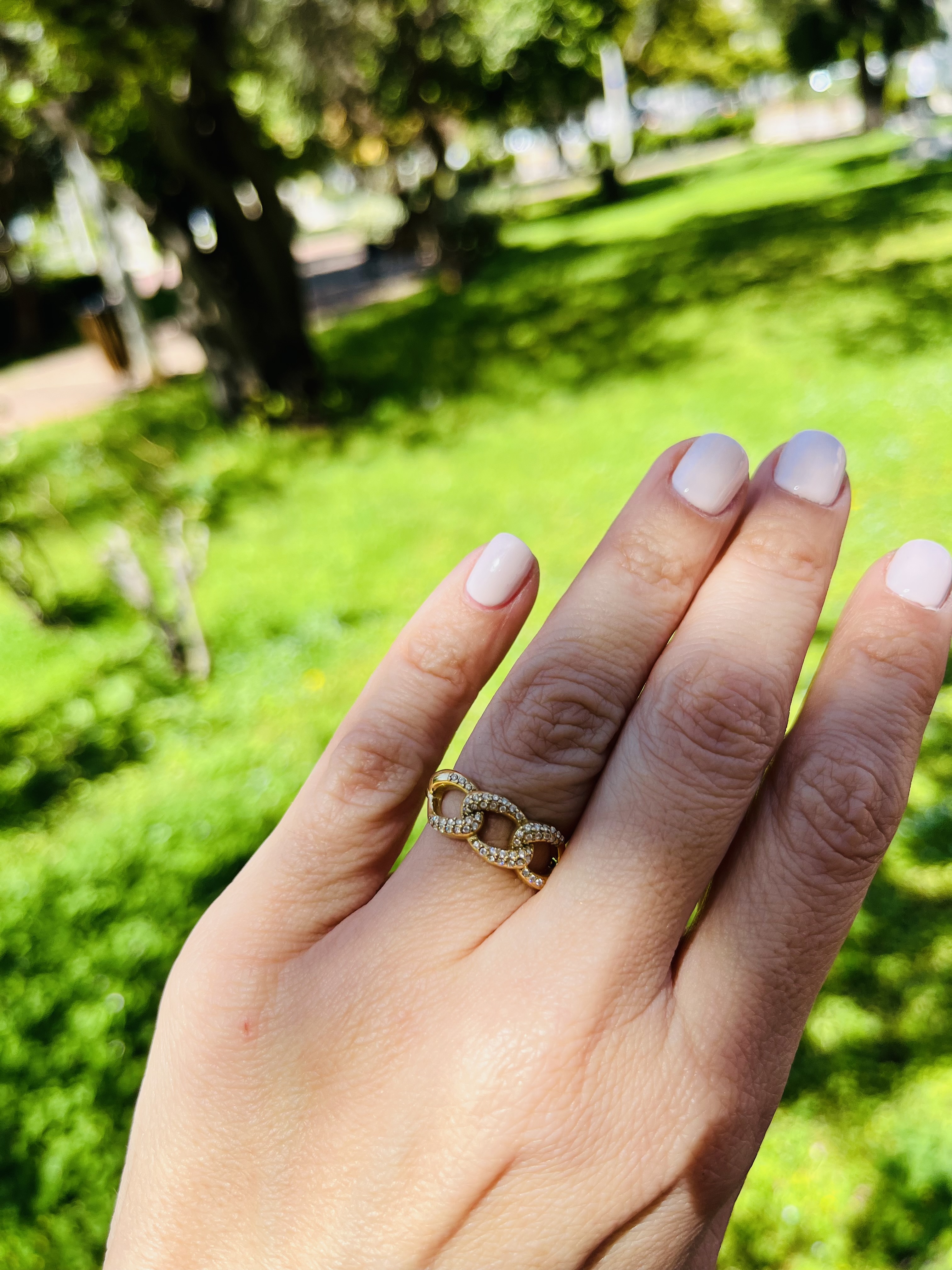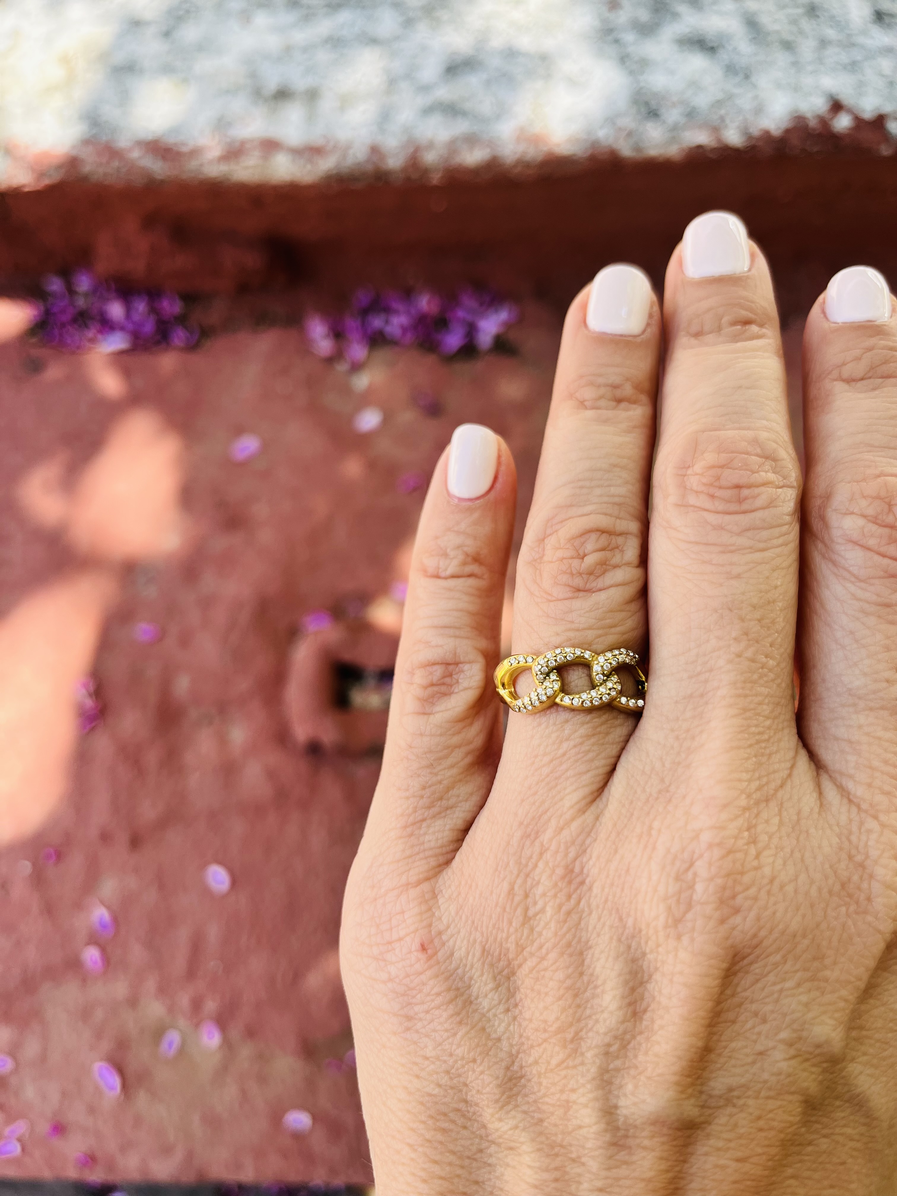 Δαχτυλίδι gold crystal chain. Ανοιχτό το κάτω μέρος, μικρή αυξομείωση. Διάμετρος 18-19 mm, περίμετρος 59-61 mm, no 9