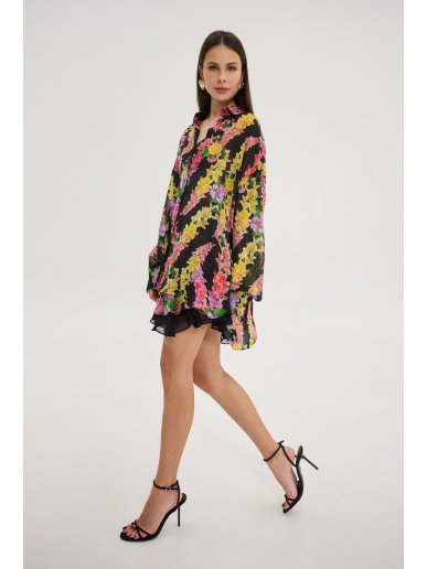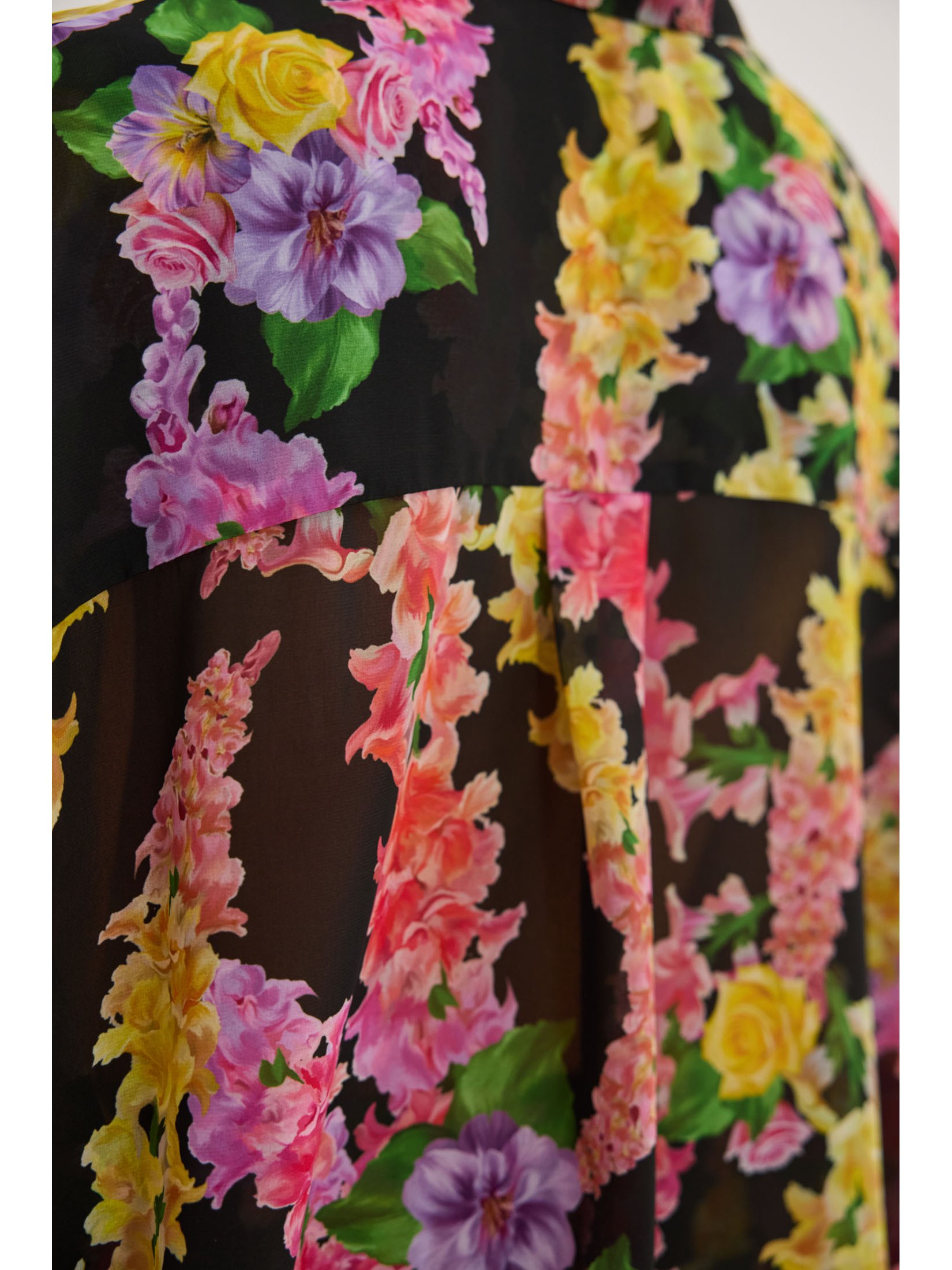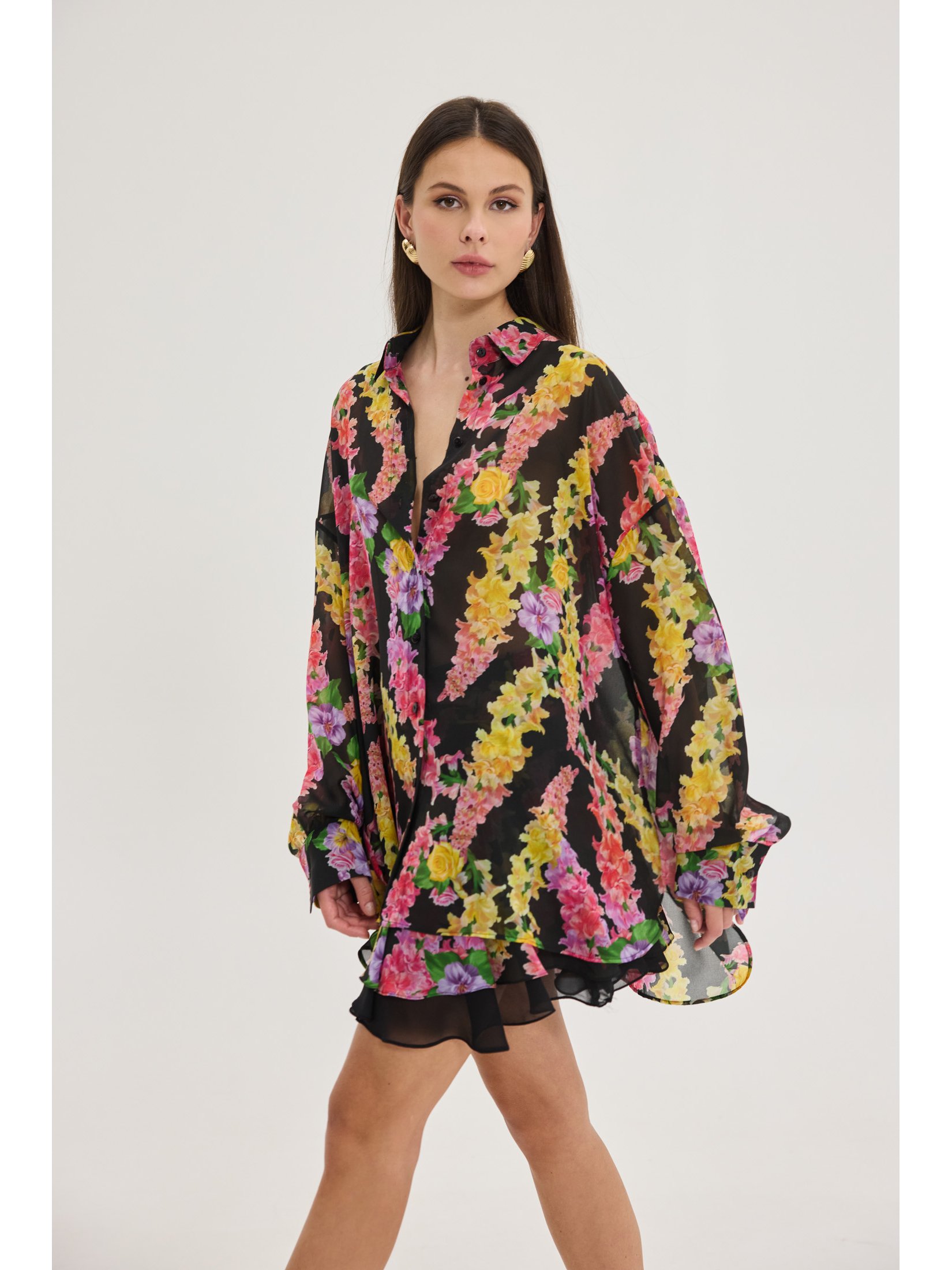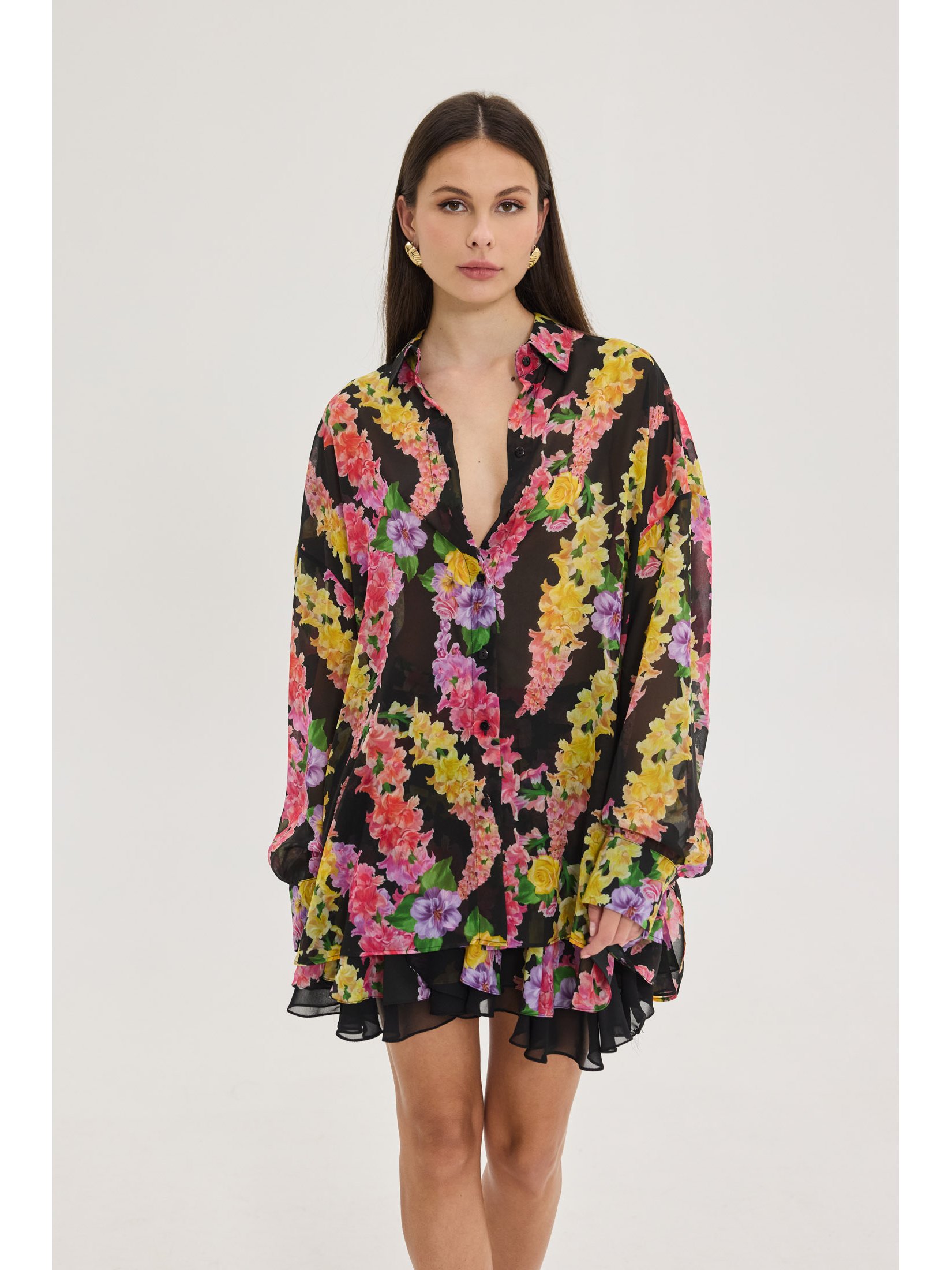 Oversized πουκάμισο με pattern λουλούδια σε μαύρο φόντο από την Hemithea. Αέρινο και μακρύ για να ταιριάζει σε όλους τους σωματότυπους. Κουμπώνει μπροστά με κουμπιά. Oversized μανίκια με δύο κουμπιά στη μανσέτα. Άνοιγμα στο πλάι για εύκολο fit. Ελαφριά σούρα στην πλάτη. Μικρός γιακάς. Το μοντέλο είναι 1,75m και φοράει OS. Σύνθεση: 100% REC PL