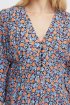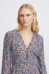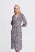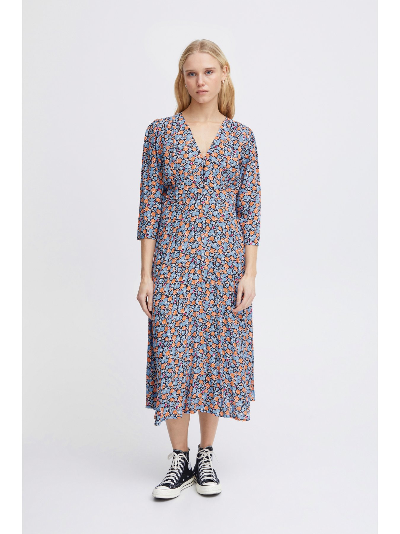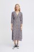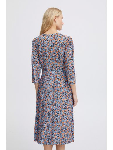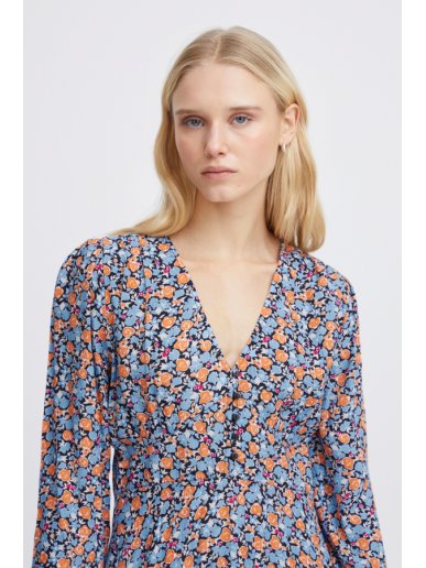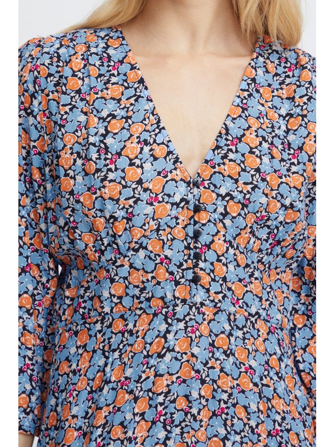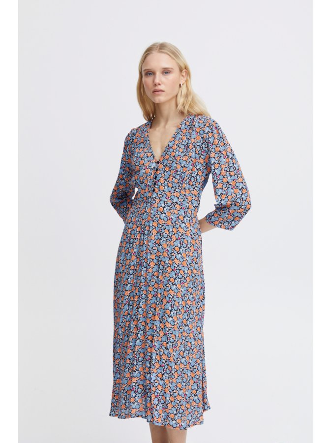 Φόρεμα με γαλάζιο φλοράλ σχέδιο από την Ichi. 3/4 μανίκια. Μίντι μήκος. V λαιμόκοψη. Λεπτομέρεια κουμπιά στο πάνω μέρος. Σύνθεση: 51% Viscose (LENZING™ ECOVERO™), 49% Viscose