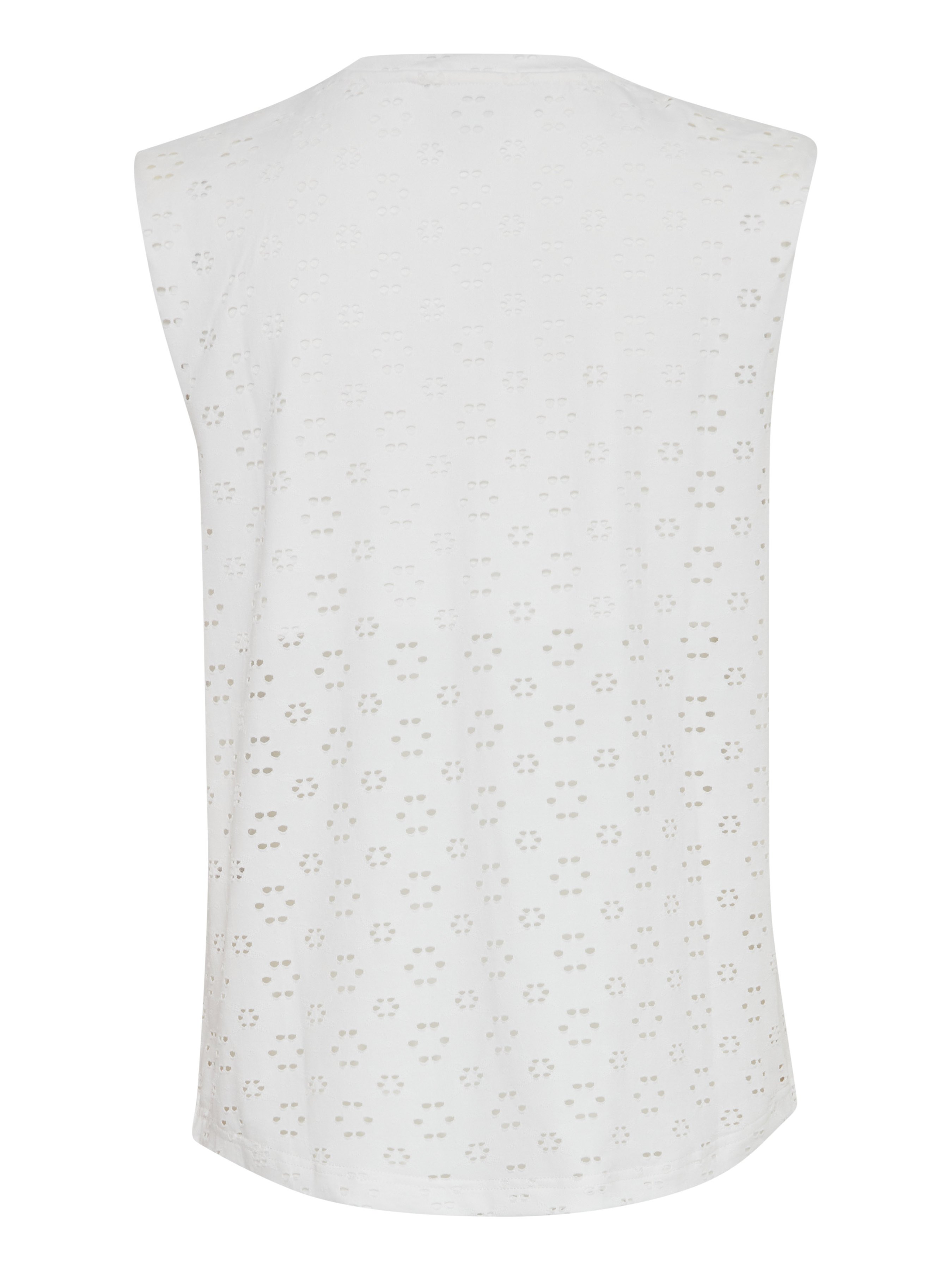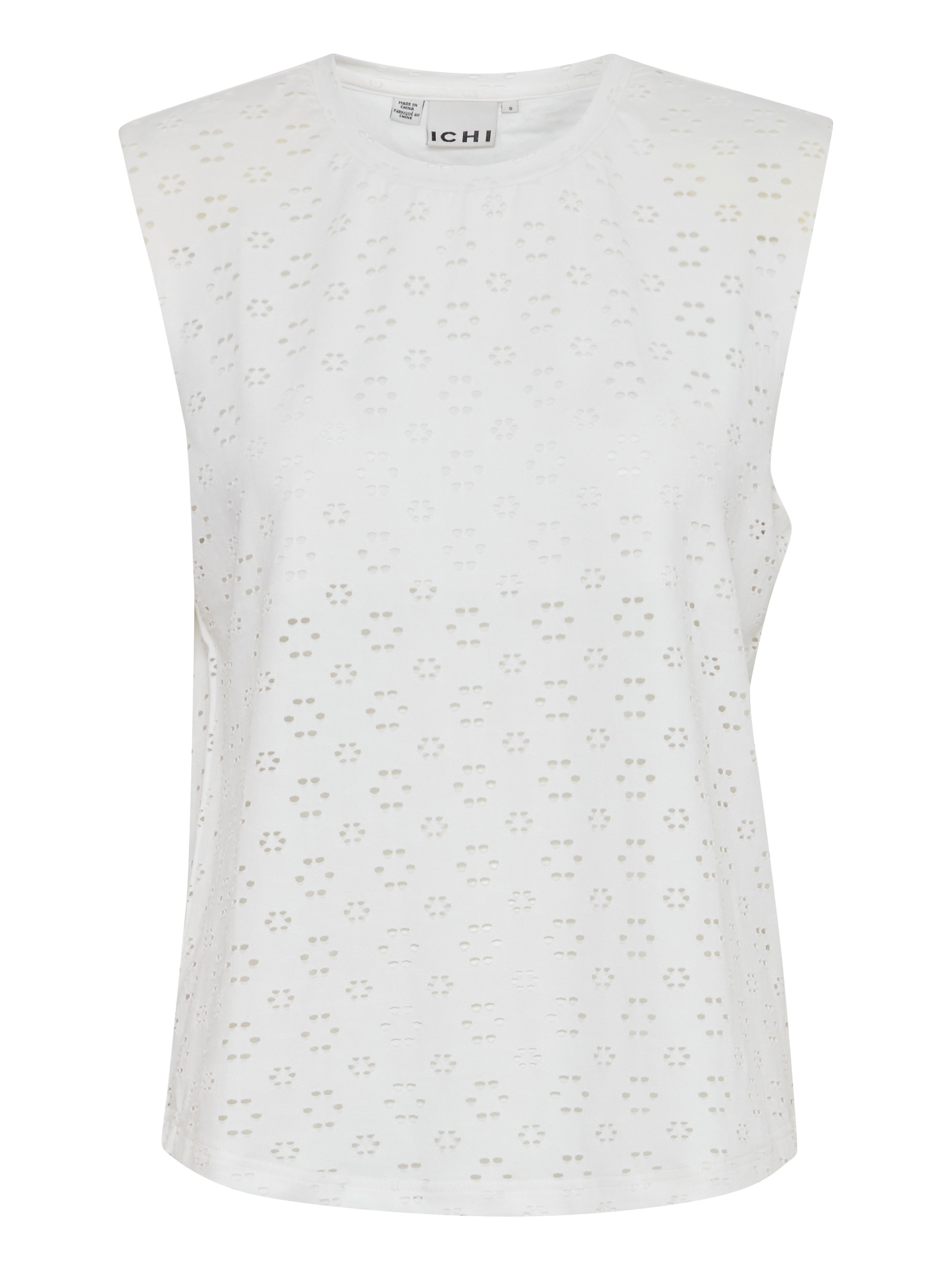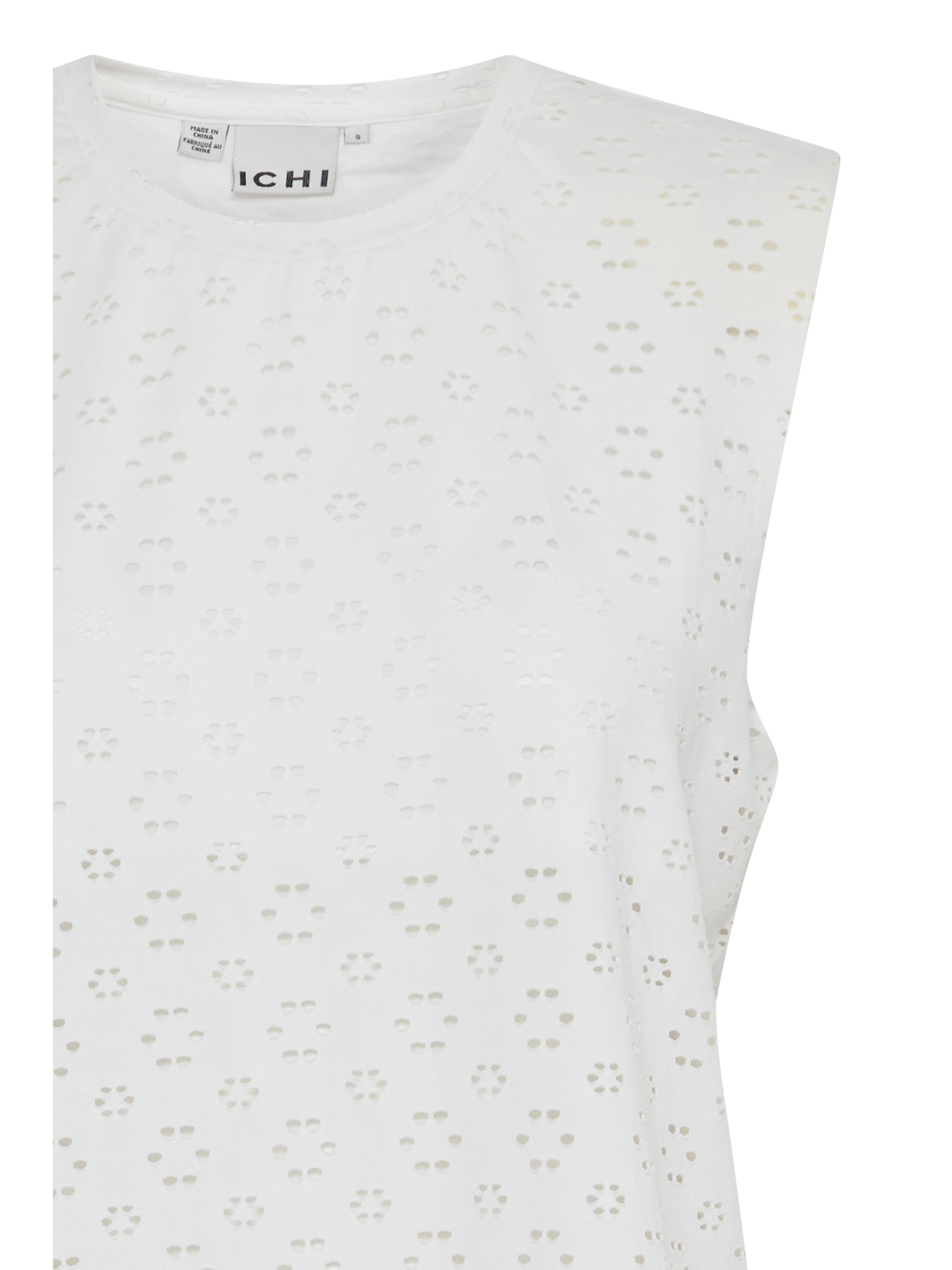 Λευκό τοπ Ichi. Με τρυπητό σχέδιο. Φόδρα λευκή. Αμάνικο. Μικρή βάτα. Σύνθεση: 95% Πολυεστέρας, 5% Ελαστάνη