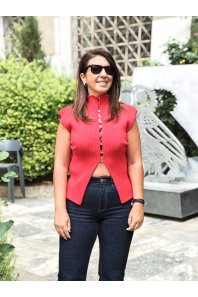 Κόκκινη knit μπλούζα ζιβάγκο με διακοσμητικά κουμπιά μπροστά από την Combos Knitwear. Αμάνικο. Ελαστικό. Σύνθεση: 52% VI, 28% PL, 20% PA