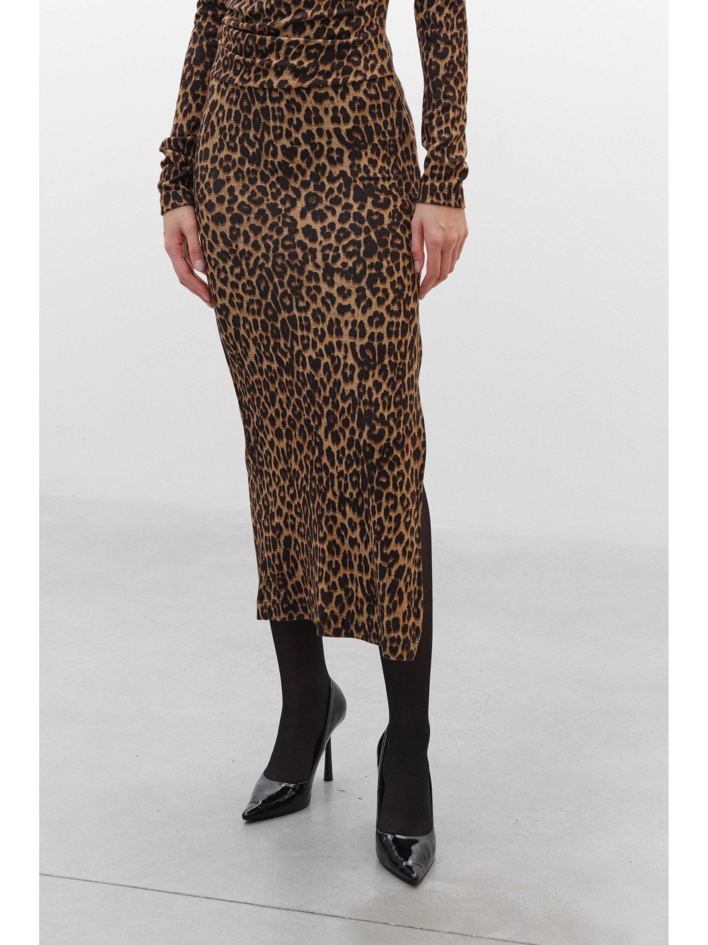 Φόρεμα ελαστικό με λεοπάρ σχέδιο και έναν ώμο Lumina. Μάλλινη υφή. Μακρύ μανίκι και σκίσιμο στο πλάι.