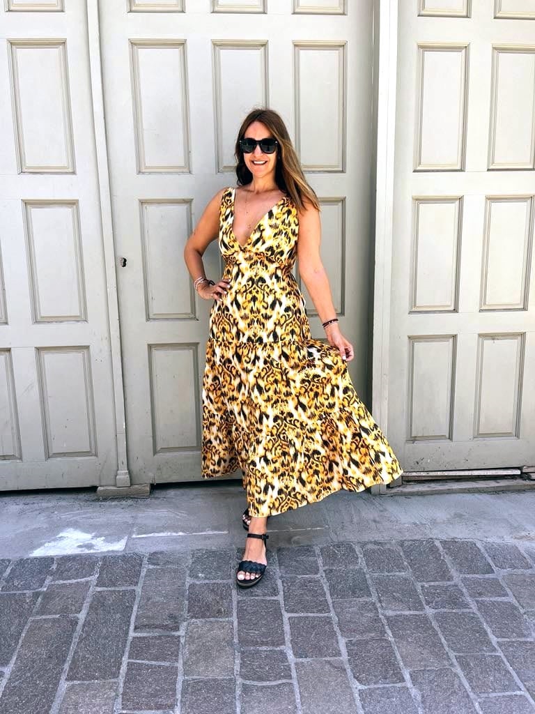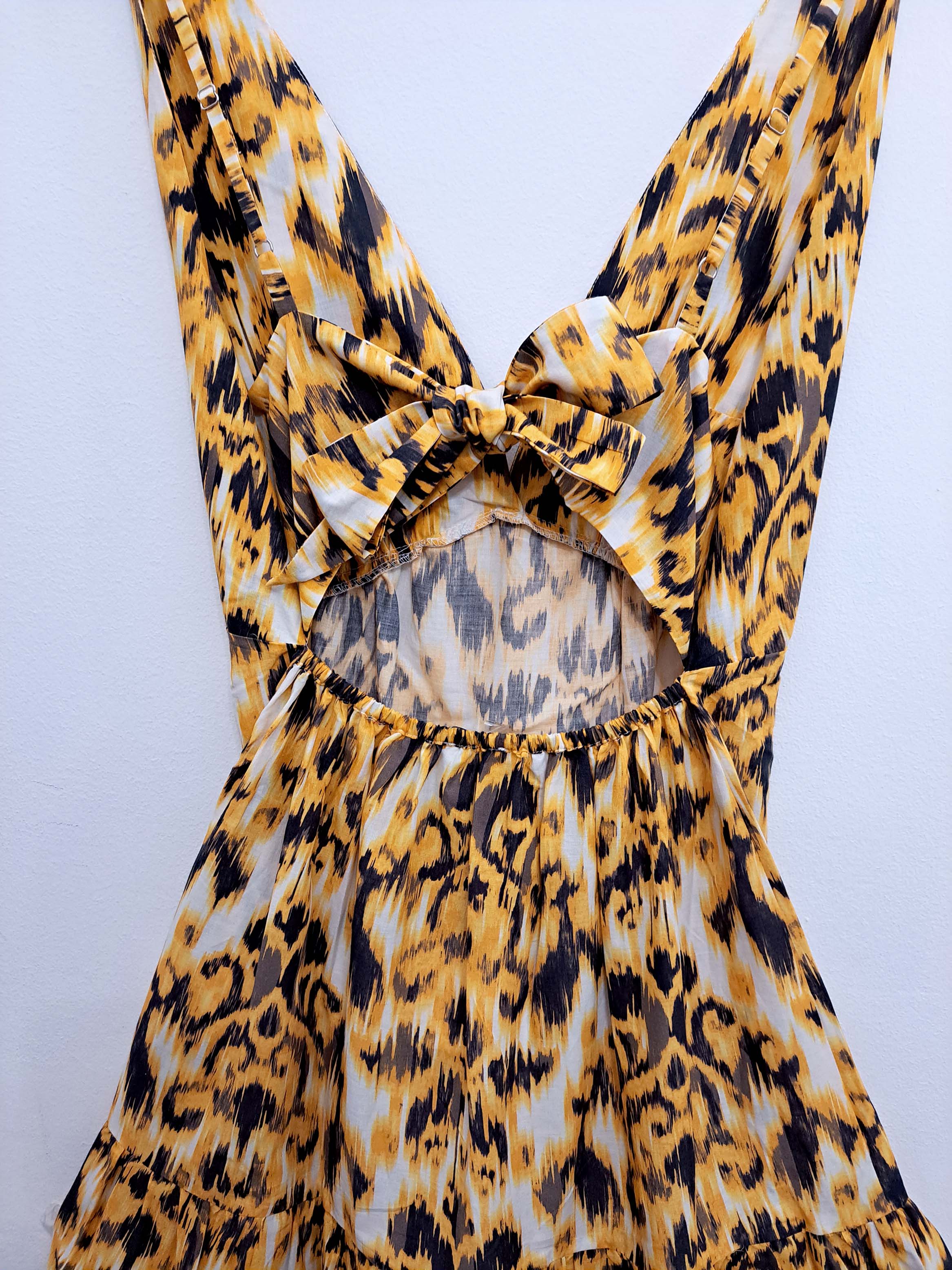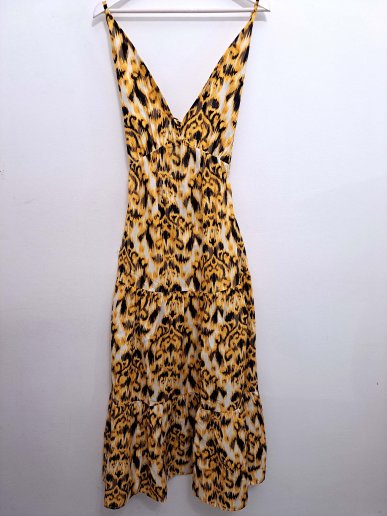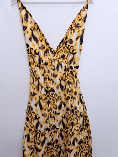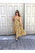 Φόρεμα μάξι με κίτρινο εμπριμέ σχέδιο από την Nisω. Λεπτές τιράντες που αυξομειώνονται. Λάστιχο στην μέση. Δένει πίσω με φιόγκο. Λεπτομέρεια βολάν στο τελείωμα. V λαιμόκοψη. Σύνθεση: 100% Βαμβάκι.