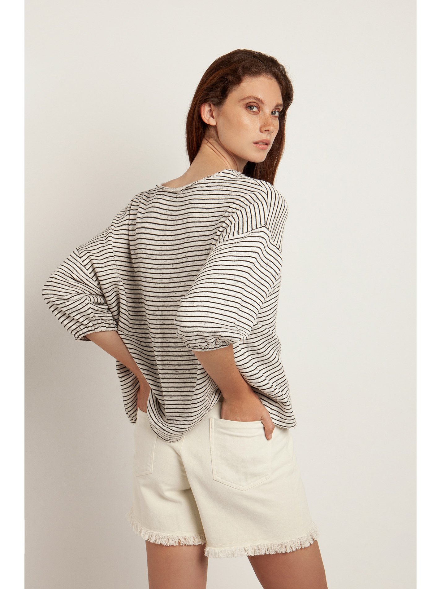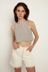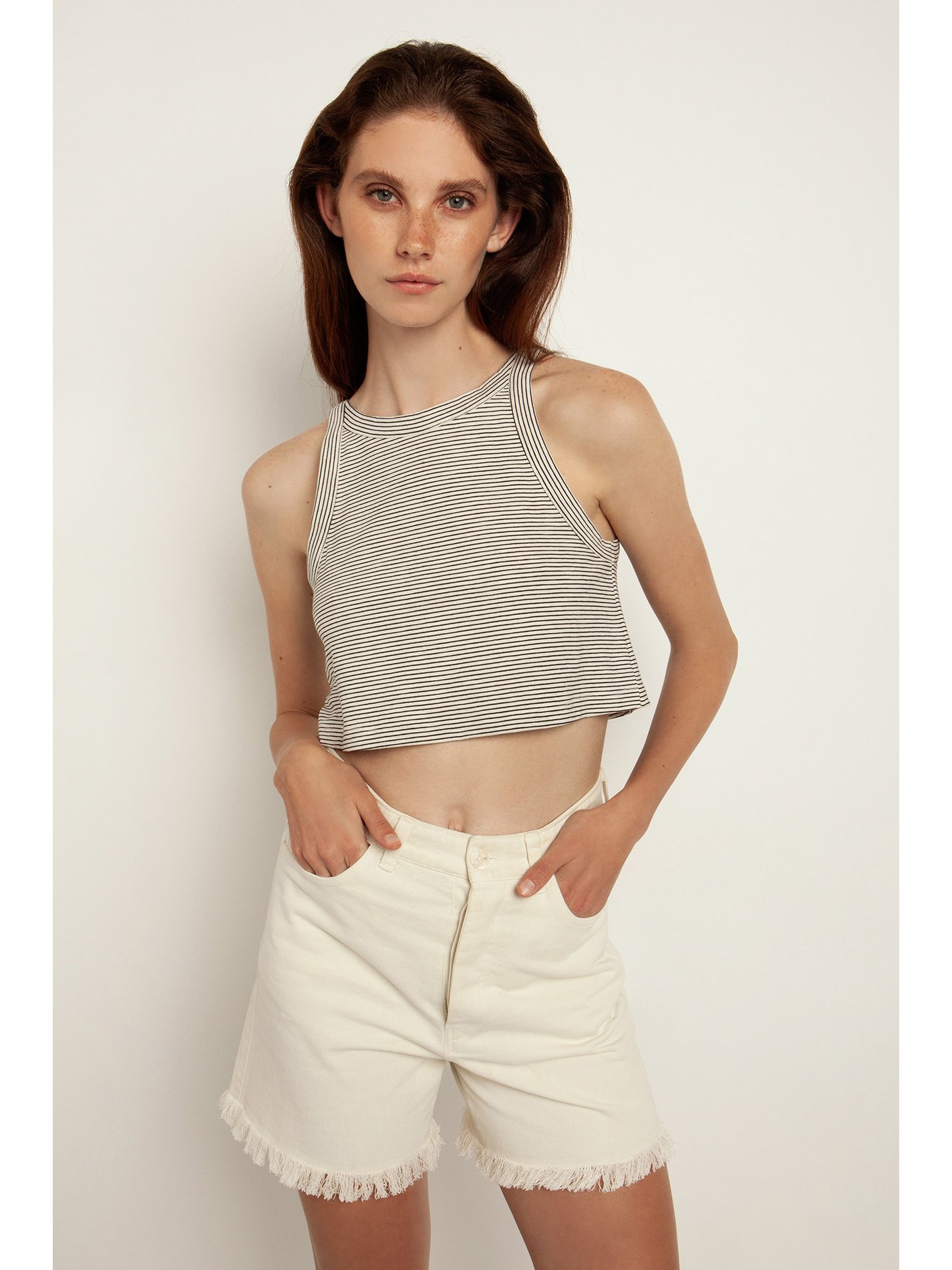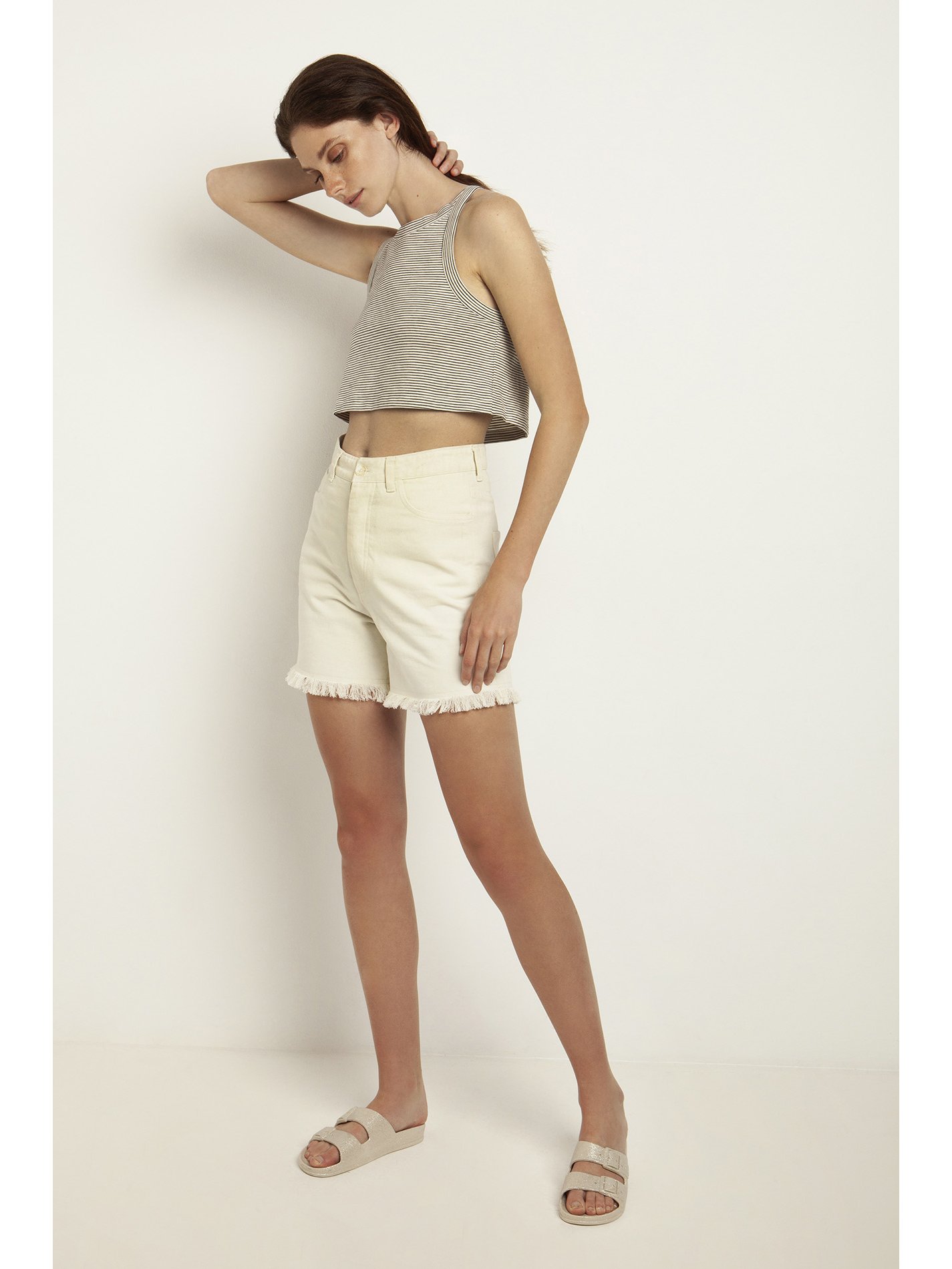 Off white ψηλόμεσο σορτς ντένιμ με τσέπες μπροστά και πίσω από την Nisω. Τελείωμα στο κάτω μέρος χωρίς ραφές. Κλείσιμο μπροστά με φερμουάρ και μεταλλικό κουμπί. Soft touch. Σύνθεση: 100% Βαμβάκι.