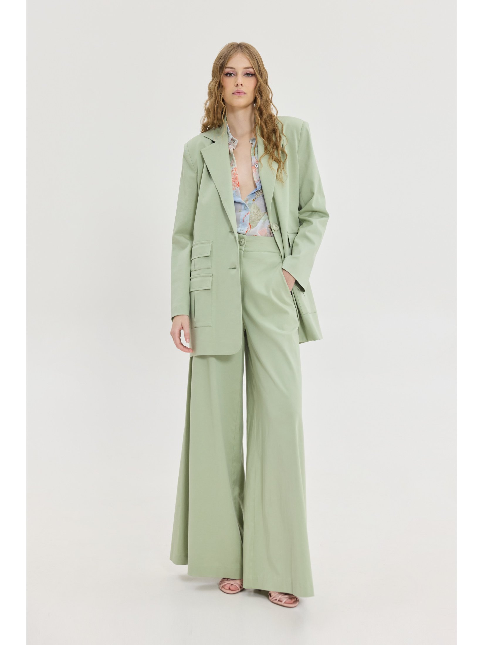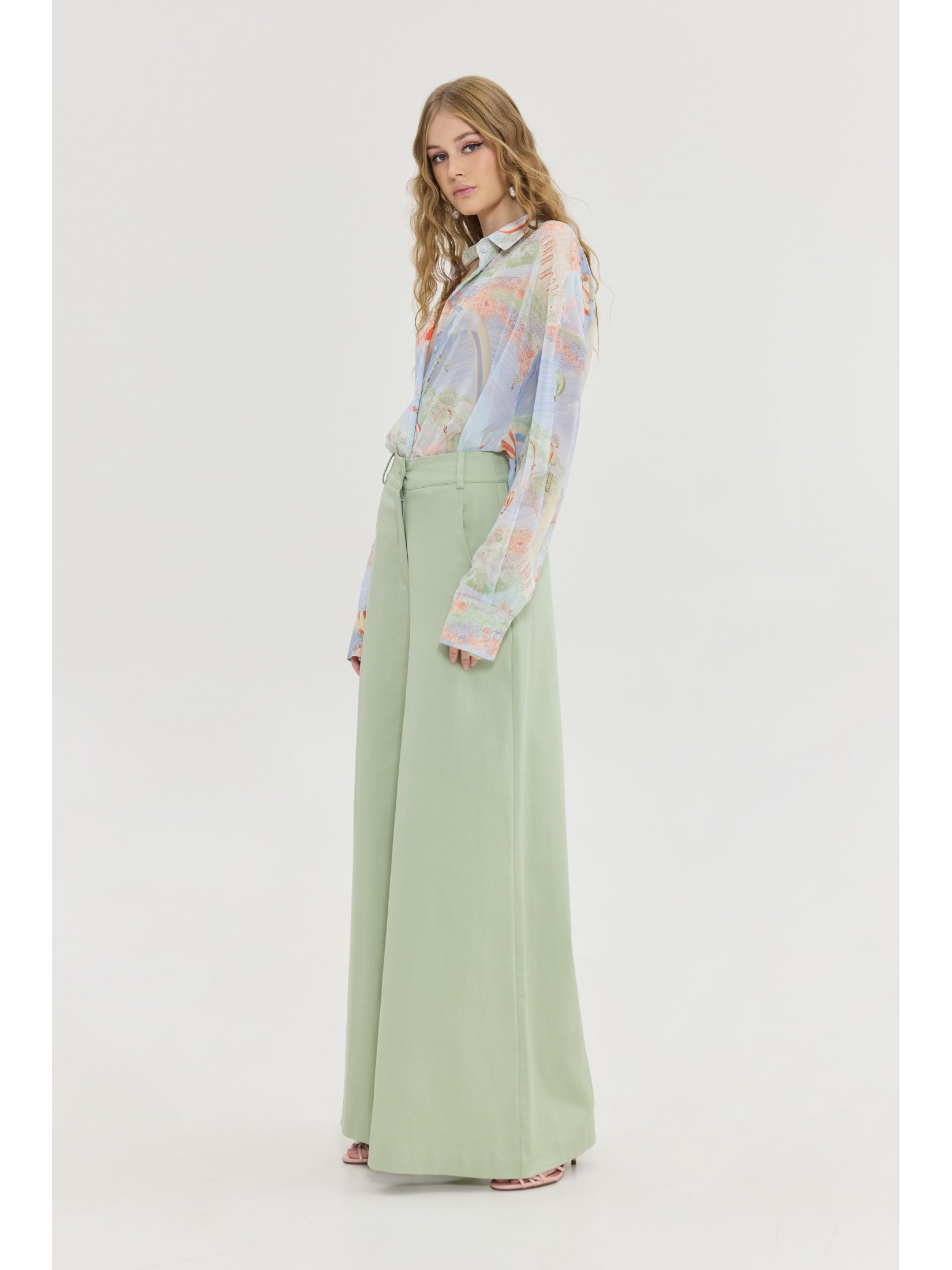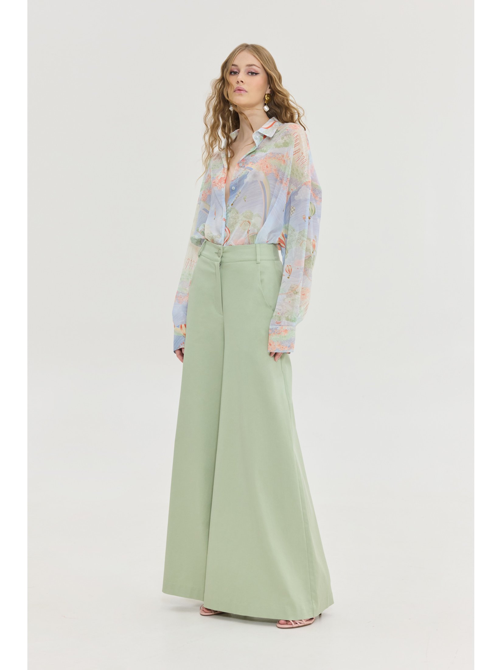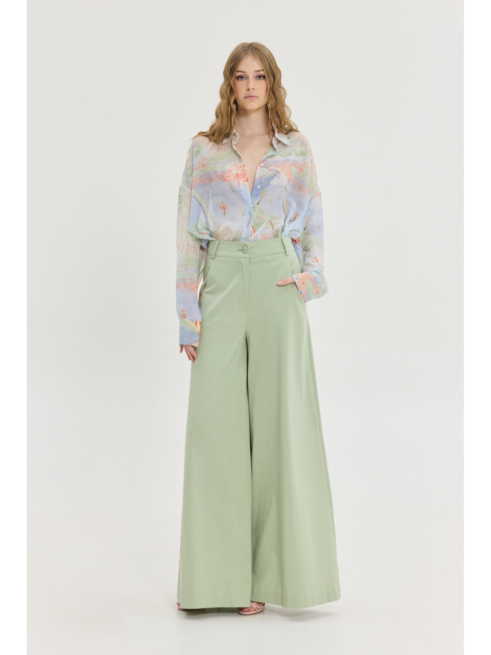 Ψηλόμεσο παντελόνι super wide leg από την Hemithea. Μονόχρωμο στο χρώμα της μέντας. 70's vibes. Ψηλόμεση γραμμή που κολακεύει την σιλουέτα. Κλείσιμο με χρυσαφί μεταλλικό κουμπί με λογότυπο και φερμουάρ. Διακοσμητικές τσέπες στο πίσω μέρος. Denim ελαφρύ ύφασμα. Σύνθεση: 55%CLY 45% CO 2%SP  Το μοντέλο είναι 1,75m και φοράει Small.