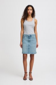 Ψηλόμεση φούστα με πέντε τσέπες από την Ichi. Με όψη ξεβαμμένου. Κλείσιμο μπροστά με φερμουάρ και κουμπί. Μίνι μήκος.