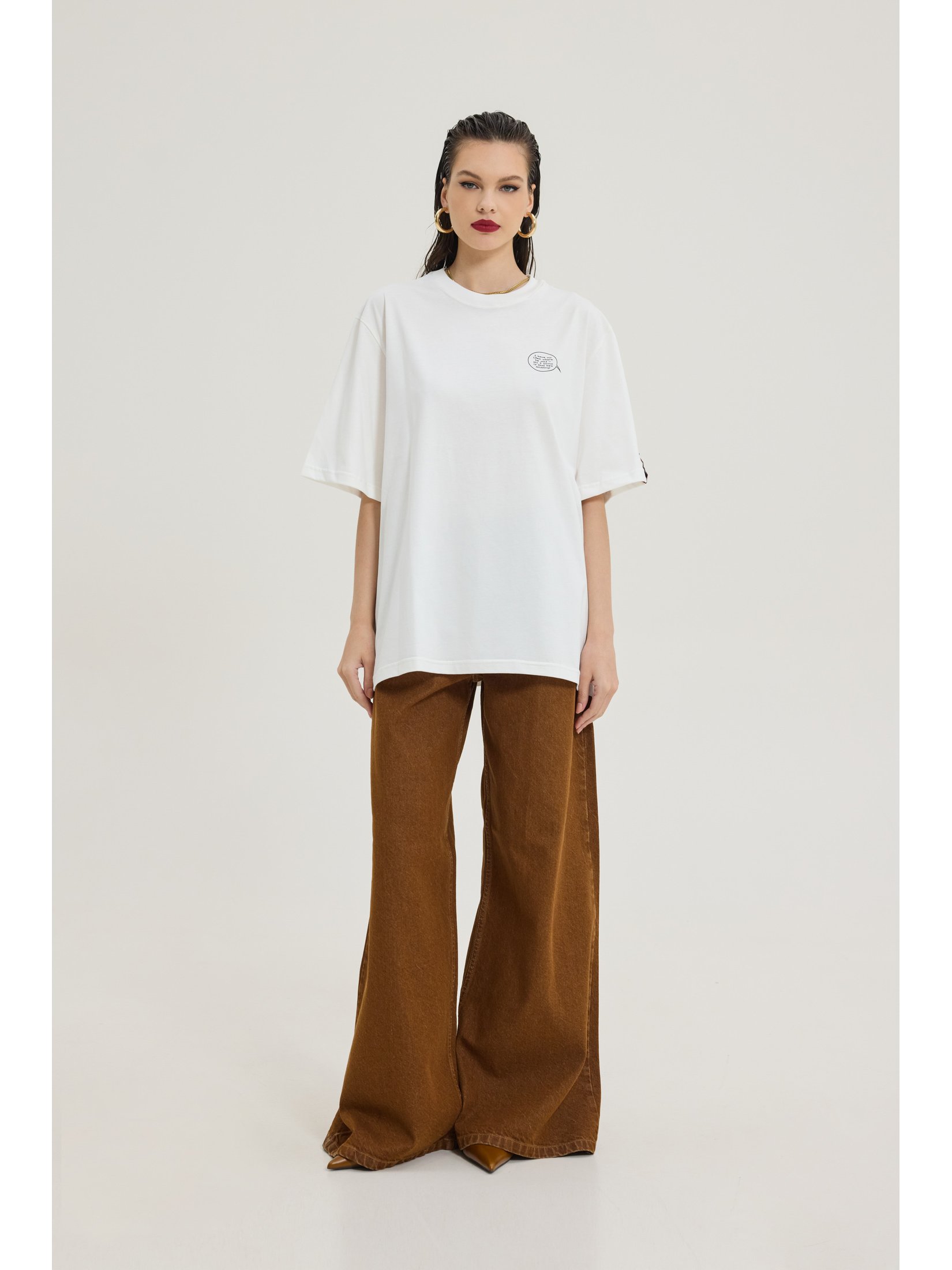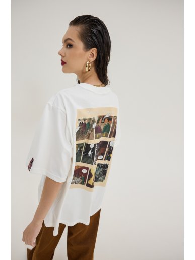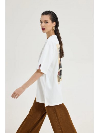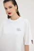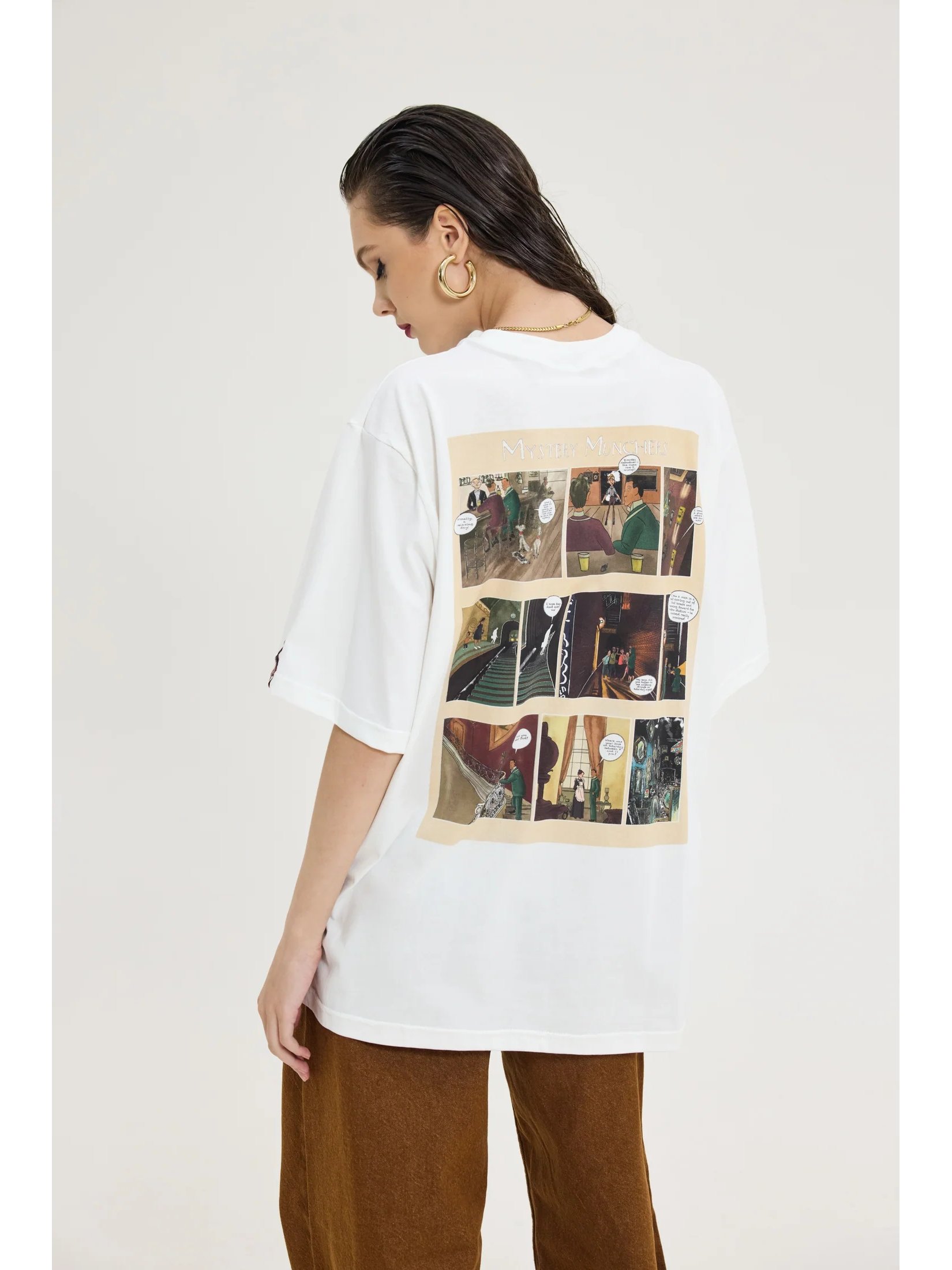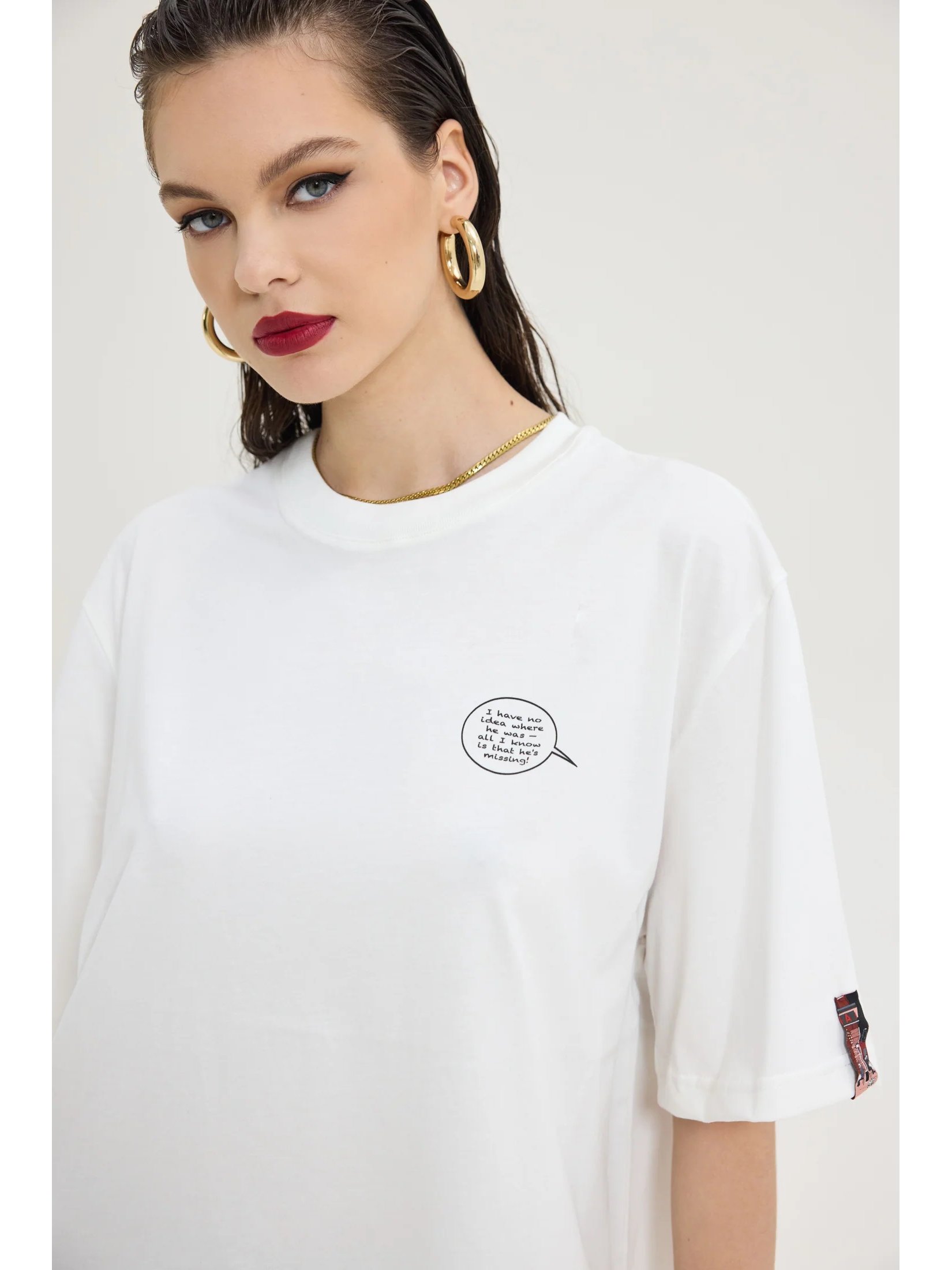Oversized t-shirt σε μονόχρωμο λευκό χρώμα και στάμπα mystery munchers από την Hemithea. Boxy και long fit. Μανίκι oversized μέχρι τον αγκώνα. Λαιμόκοψη. Το μοντέλο είναι 1,77m και φοράει OS. Σύνθεση: 100% Βαμβάκι.