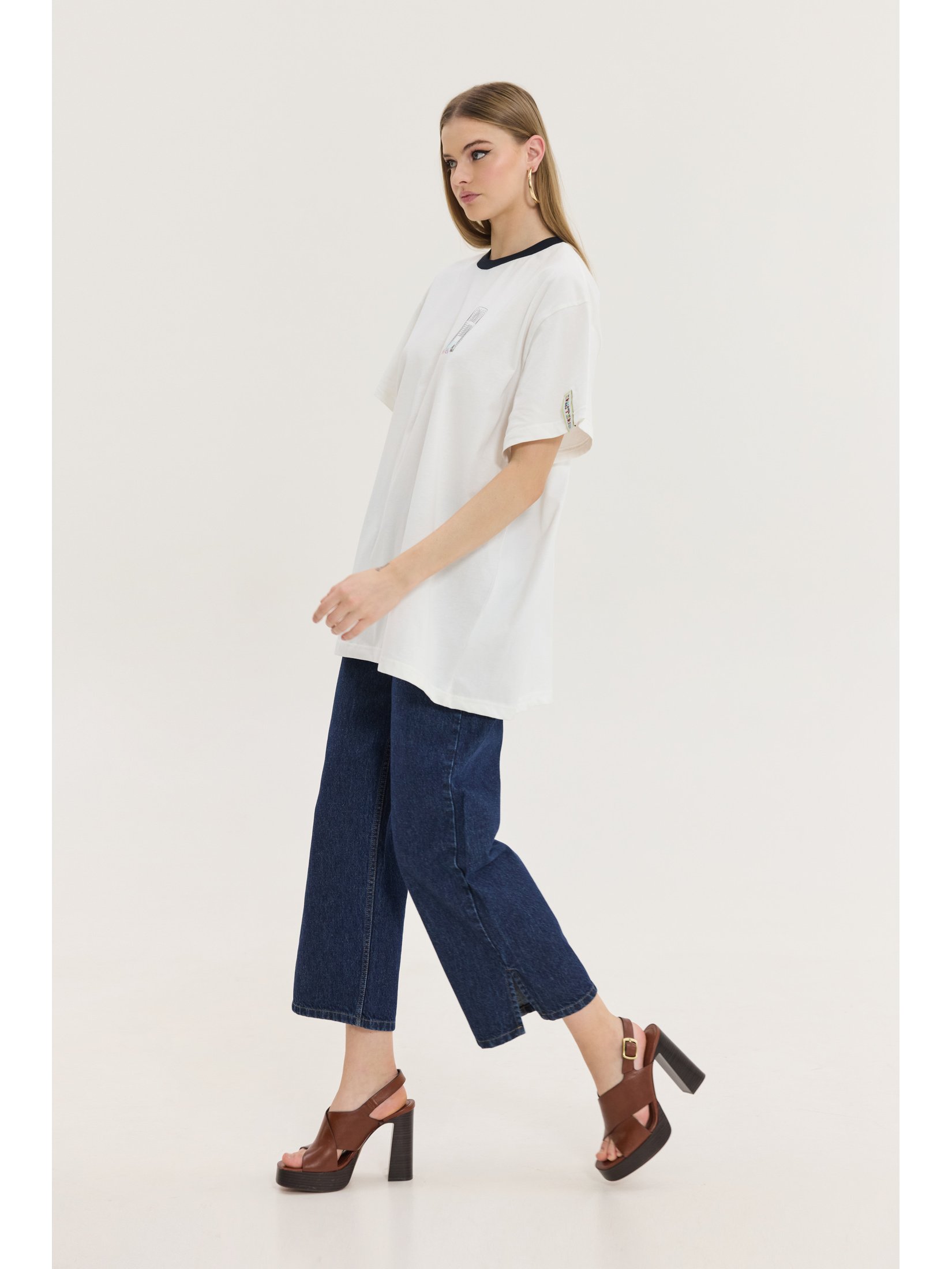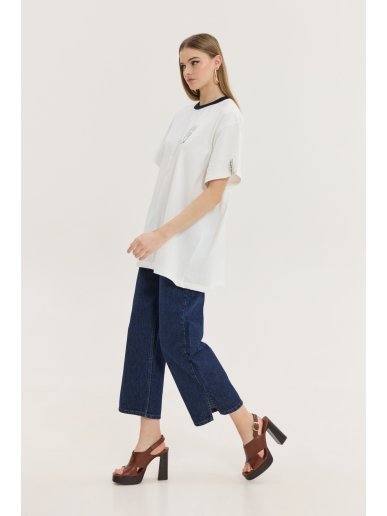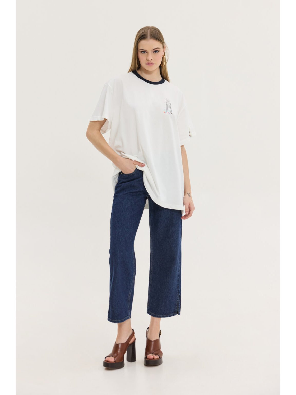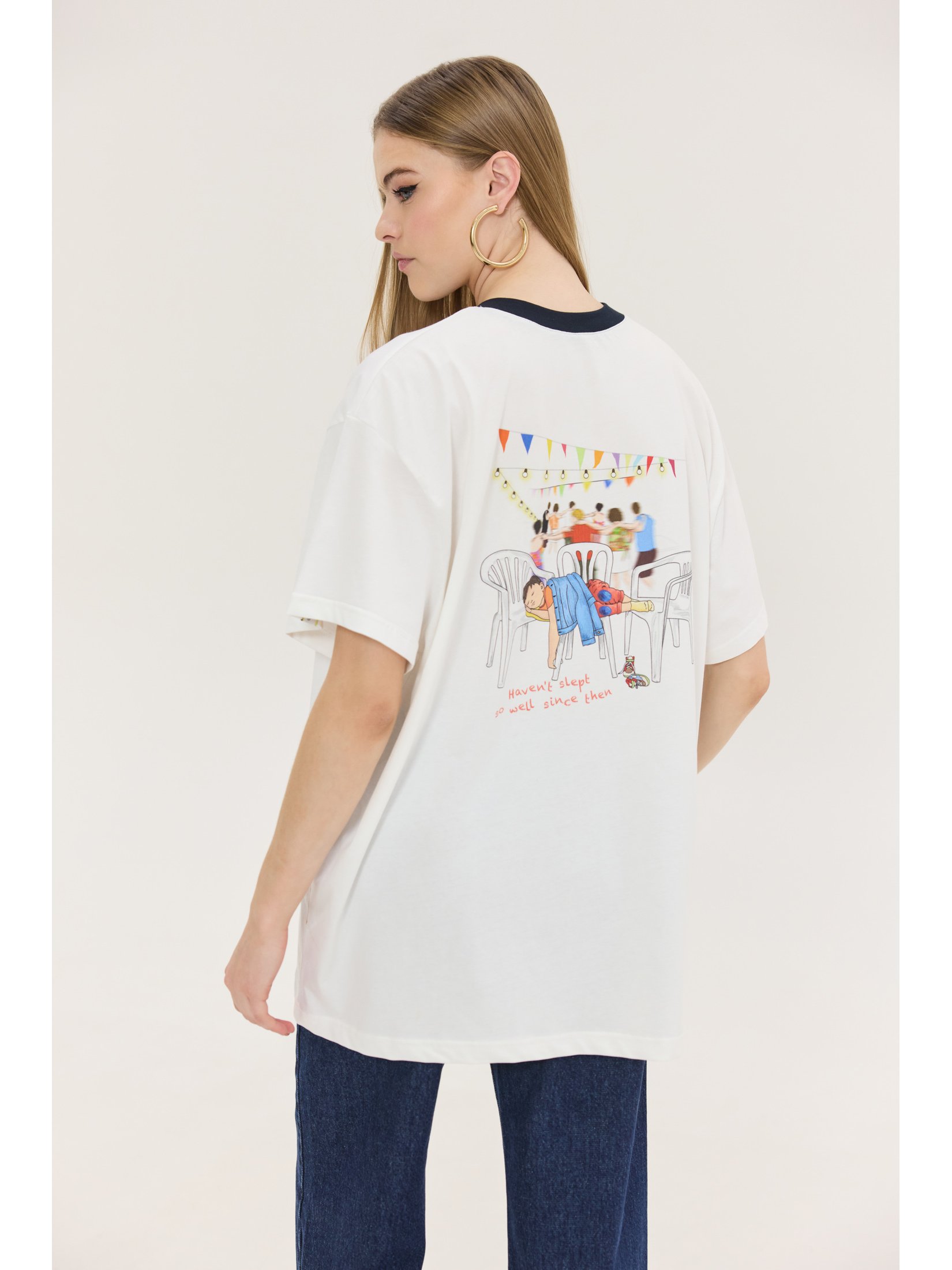 Oversized T-shirt in solid white color with a “Panigiri” (festival) print on the back by Hemithea. Plastic chairs print and logo on the front. Boxy and long fit. Oversized sleeves reaching the elbow. Crew neckline. Extra woven label. The model is 1.75 m tall and wears OS (One Size). Composition: 100% Cotton.