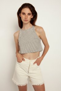 Off white ψηλόμεσο σορτς ντένιμ με τσέπες μπροστά και πίσω από την Nisω. Τελείωμα στο κάτω μέρος χωρίς ραφές. Κλείσιμο μπροστά με φερμουάρ και μεταλλικό κουμπί. Soft touch.