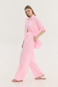 Πλεκτό παντελόνι wide leg σε μονόχρωμο ροζ χρώμα από την Hemithea. Λάστιχο στην μέση. Ελαφρώς διάτρητο με κάθετη διάταξη. Medium length.