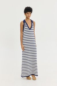 Μάξι πλεκτό φόρεμα με πλέξη με δύο χρώματα, μπλέ και λευκο, από την Hemithea. Ριγέ ύφανση ελαφρώς διάτρητο σχέδιο. V neck με γιακά. Ριπ ύφανση. Κλειστή πλάτη με παρτούς ώμους. Υφαντό ταμπάκι στην πλάτη. Φούστα A-line.