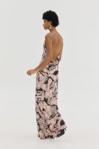Μάξι φόρεμα με σχέδιο κοχύλια με ροζ αποχρώσεις σε μαύρο φόντο από την Hemithea. Ντραπέ μπούστο. Ανοιχτή πλάτη με ντραπέ τελείωμα. Λεπτές τιράντες που αυξομειώνονται. Αέρινο ύφασμα με φόδρα. Κανονική γραμμή.