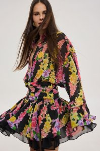 Μίνι κλος φούστα με pattern με λουλούδια σε μαύρο φόντο από την Hemithea. Ασύμμετρη με βολάν και εσωτερική μάυρη φόδρα. Κλείσιμο με φερμουάρ. Μπάσκα με σούρες μέχρι τους γοφούς.