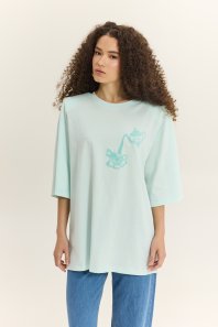 Μονόχρωμο aqua oversized t-shirt από την Hemithea. Βάτες για extra όγκο στους ώμους. Σχέδιο με βελούδινη στάμπα τσαγιέρα. Boxy και long fit. Μανίκι oversized μέχρι τον αγκώνα. Στρογγυλή λαιμόκοψη. Το μοντέλο είναι 1,77m και φοράει OS Σύνθεση: 100% cotton.