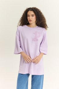 Oversized t-shirt σε μονόχρωμο λιλά χρώμα και στάμπα retro toy με logo στο μπροστινό μέρος από την Hemithea. Boxy και long fit. Μανίκι oversized μέχρι τον αγκώνα. Λαιμόκοψη. Extra υφαντό ταμπάκι. Το μοντέλο είναι 1,75m και φοράει OS. Σύνθεση: 100% Βαμβάκι.