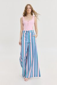 Ψηλόμεσο παντελόνι super wide leg από την Hemithea. Pattern retro ρίγες. 70s vibes. Ψηλόμεση γραμμή που κολακεύει την σιλουέτα. Κλείσιμο με χρυσαφί μεταλλικό κουμπί με λογότυπο και φερμουάρ. Διακοσμητικές τσέπες στο πίσω μέρος. Denim ελαφρύ ύφασμα.